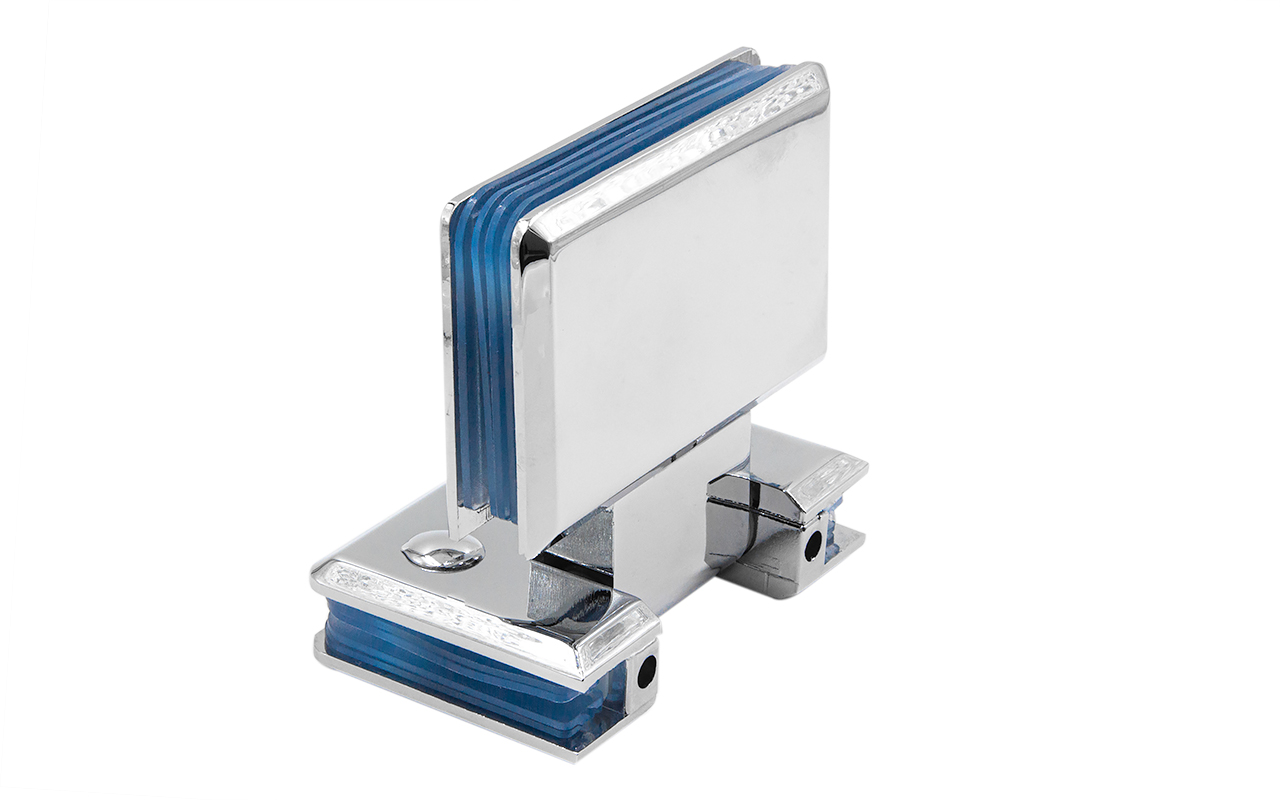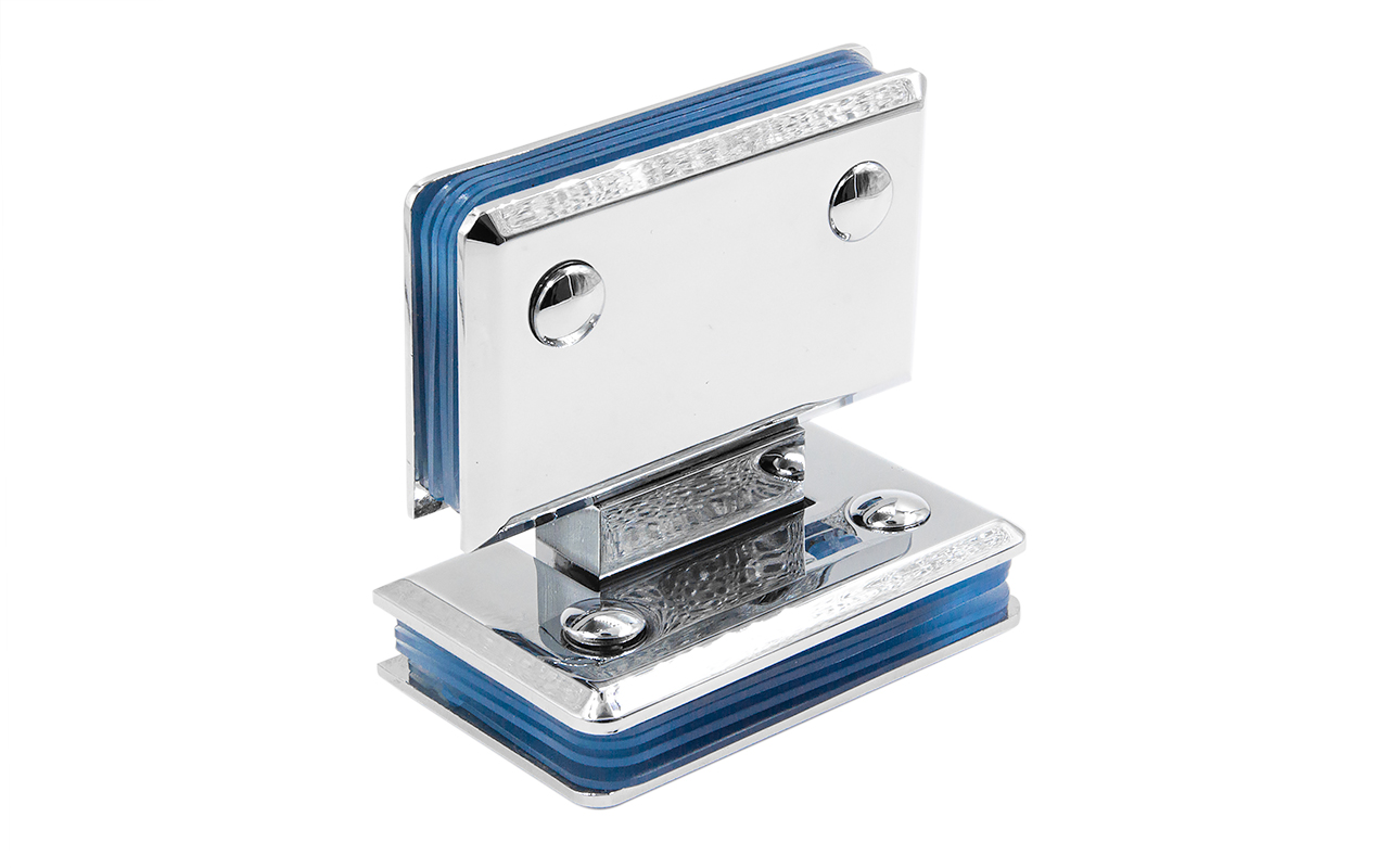 Петля из латуни с полированной поверхностью из хрома предназначена для стыковки между собой конструкционных элементов из стекла, толщина которых находится в диапазоне от 8 до 10 мм. Максимальный вес двери на 2 петли составляет 45 кг. В конструкции заложена система скрытого крепежа. Имеет функцию доводчика до закрытия от 25°. Максимальный угол разведения стыковочных элементов в плане составляет 180°.
