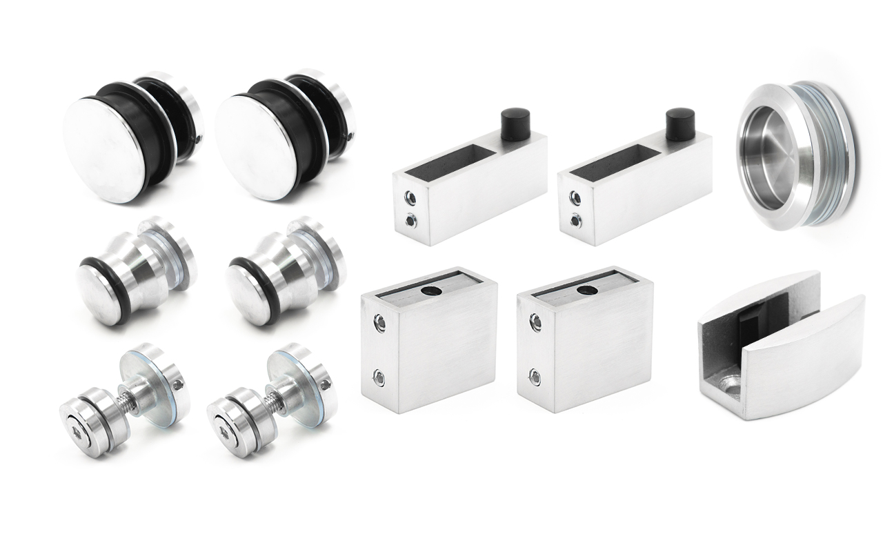 ролик (2 шт.), крепеж стекла к трубе (2 шт.), крепеж направляющая (2 шт.), напольная направляющая (1 шт.), торцевое крепление трубы к стене (2 шт.), стопор (2 шт.), дверная ручка (1 шт.)