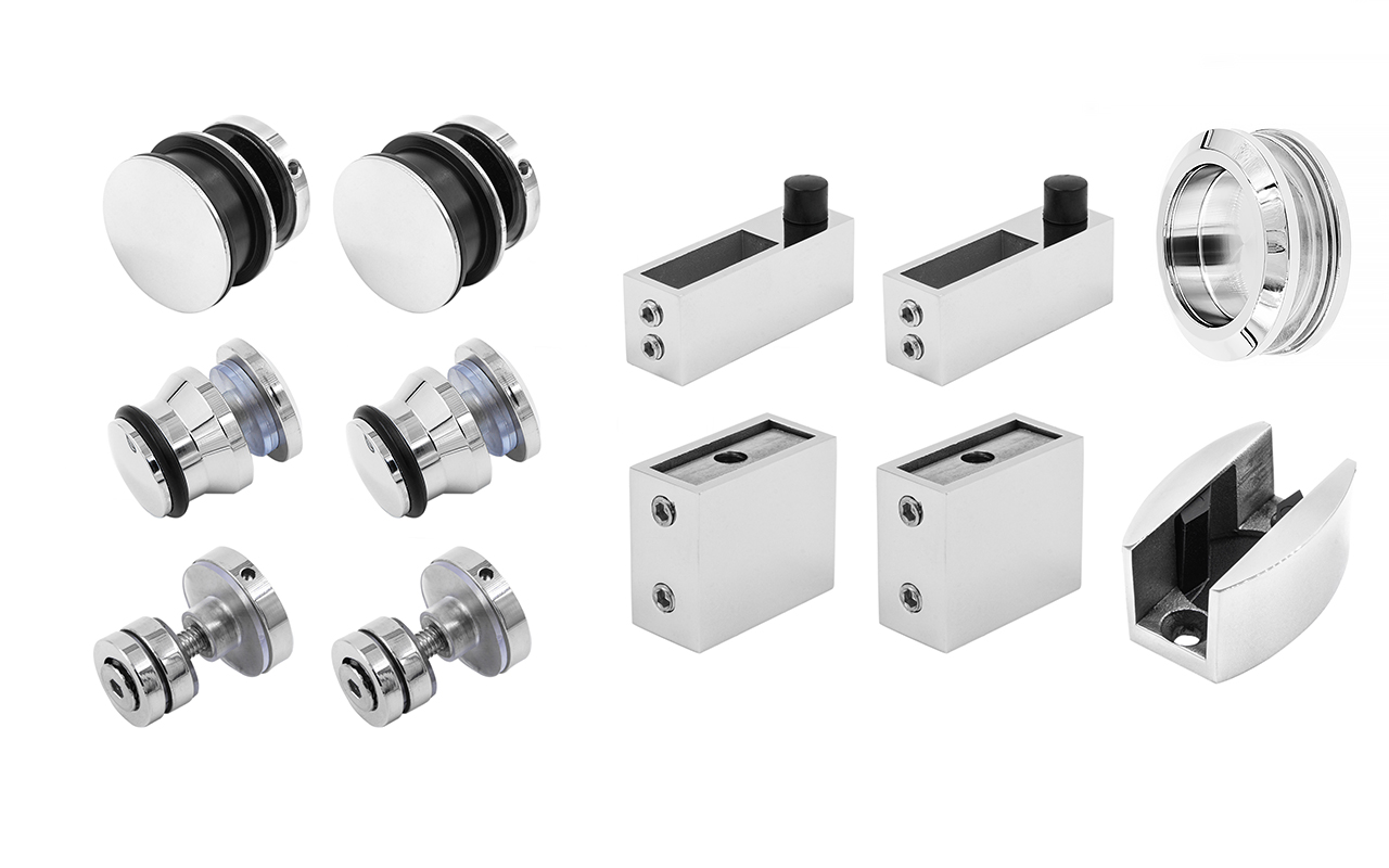 ролик (2 шт.), крепеж стекла к трубе (2 шт.), крепеж направляющая (2 шт.), напольная направляющая (1 шт.), торцевое крепление трубы к стене (2 шт.), стопор (2 шт.)