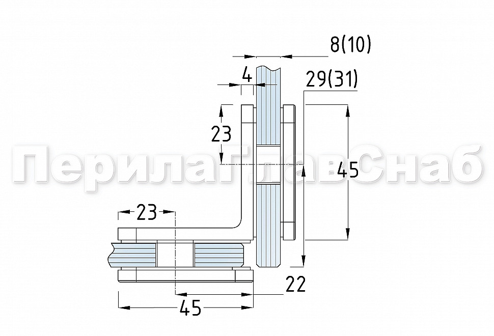 Коннектор для душевой кабины стекло-стекло 90°, 45х45 мм. Материал - латунь-хром, поверхность - полированная