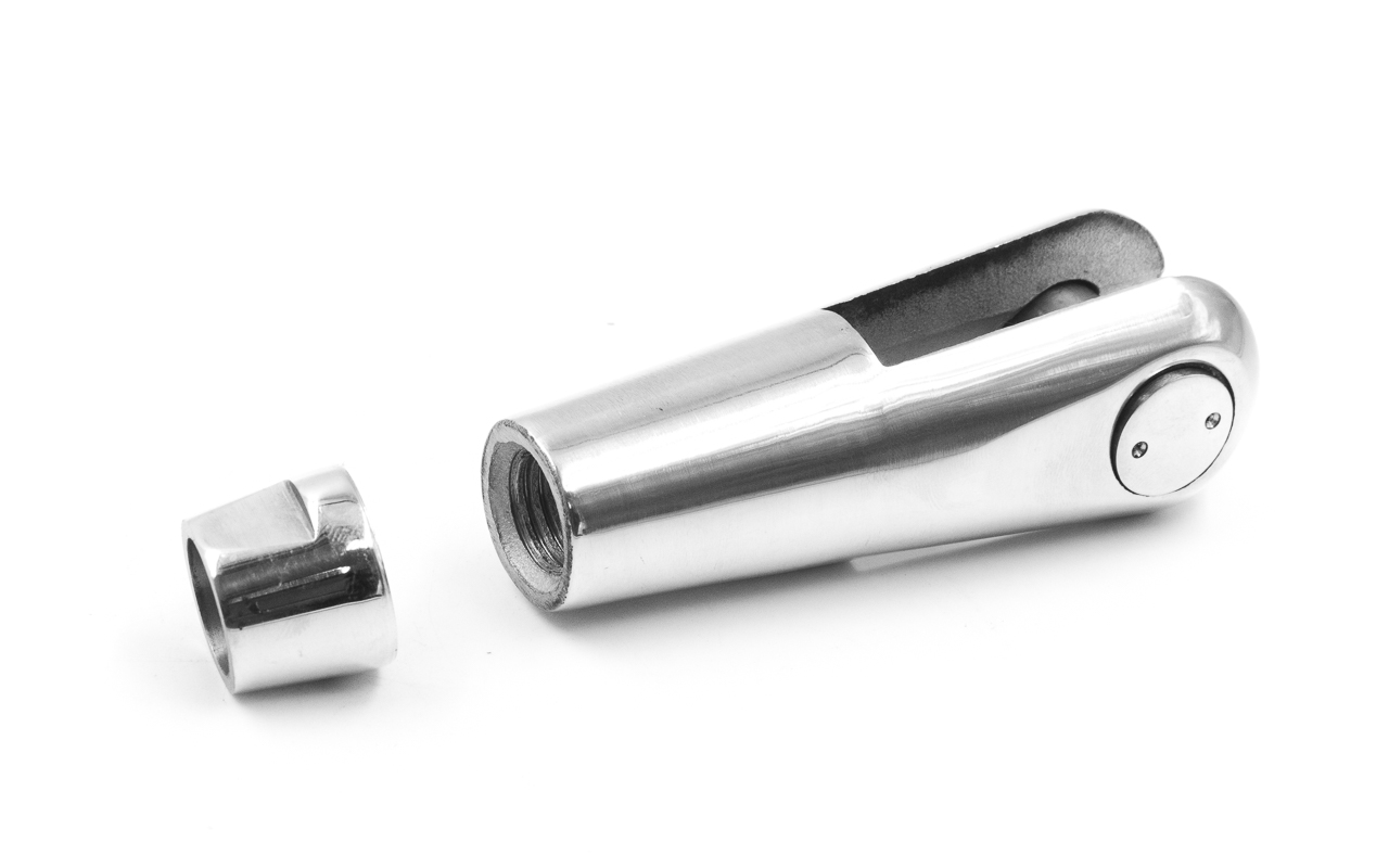 Наконечник состоит из тела с технологическим отверстием М16 и фиксатора для крепления к серьге. Деталь выполнена из стали AISI 304. Длинна наконечника 138 мм от начала ванты до середины фиксатора. Ширина 34 мм. Длинна паза в месте расположения фиксатора 50 мм, а ширина 15 мм. Выдерживает максимальную нагрузку 1000 кг. Данный наконечник, как правило, покупают с деталью-близнецом с противоположно направленной резьбой k661-R. Модификацию уточняйте у наших менеджеров. В качестве аналога можно рассмотреть наконечник k654-L.