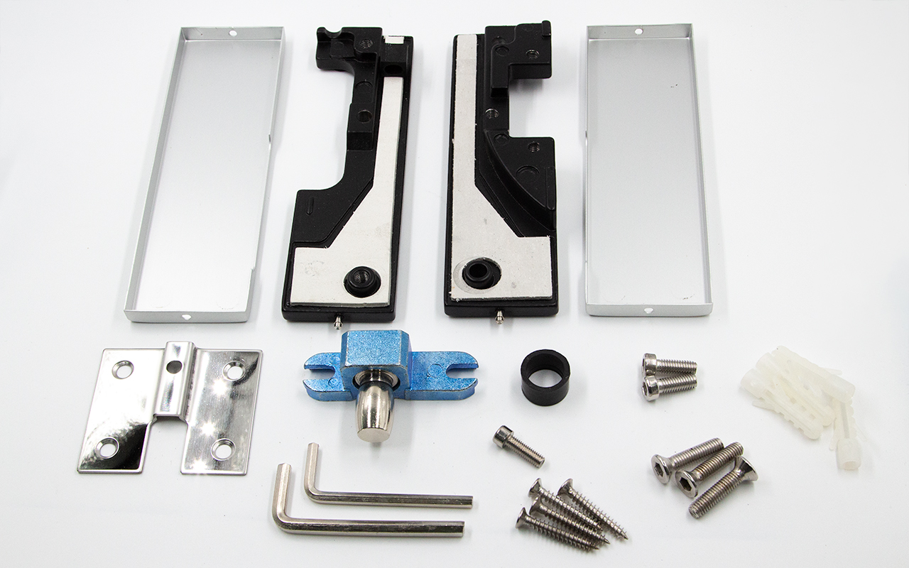 фиксируем к стене дюбель саморезами, далее сбоку нажимаем на крепления крышек и снимаем. Отвинчиваем винты, и фиксируем фитинг в подготовленный вырез в стекле. Далее закручиваем и фиксируем обратно крышки.