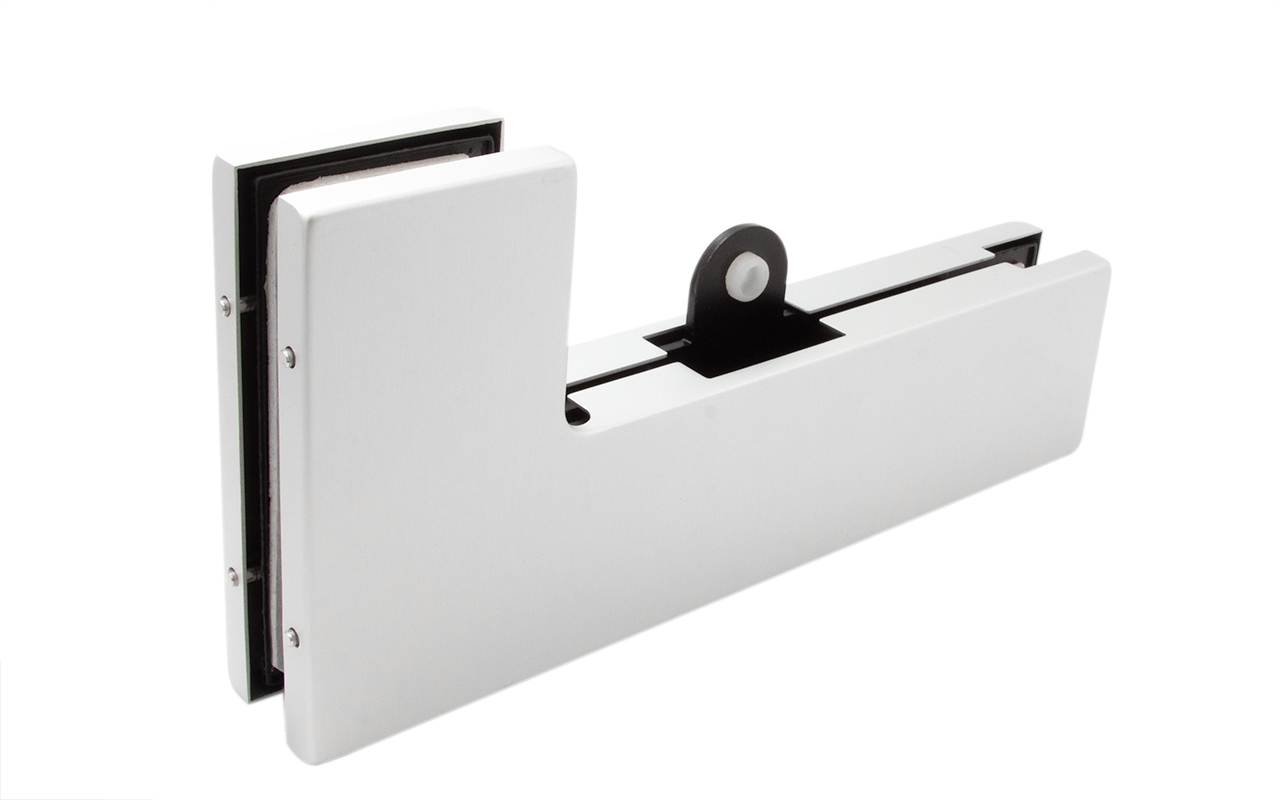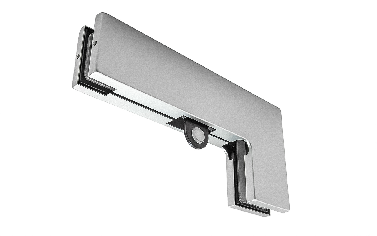 для соединения стационарной панели стеклянной перегородки с верхней фрамугой. Стопор ограничивает открывание двери в любую из сторон по выбору.