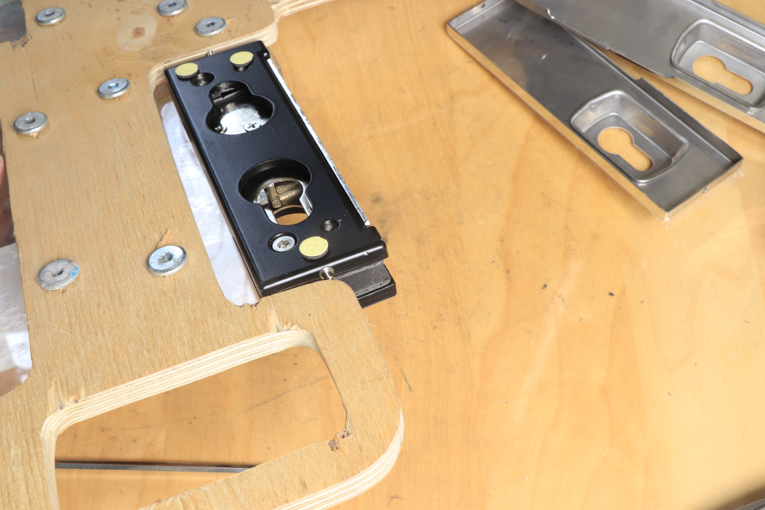 замок угловой с круглым ригелем устанавливается, как правило, в углу двери снизу. В качестве ответной части в пол может использоваться t154 SSS «грибок» с подпружиненной крышкой.