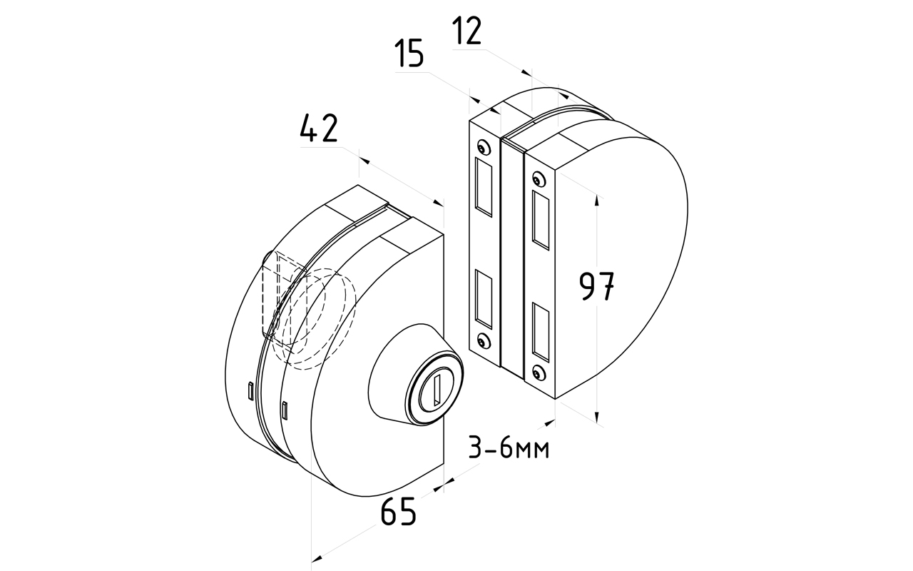 для раздвижных дверей, с ответной частью на стекло устанавливается без вырезов в стекле, таким образом, его можно поставить уже после монтажа раздвижных дверей.