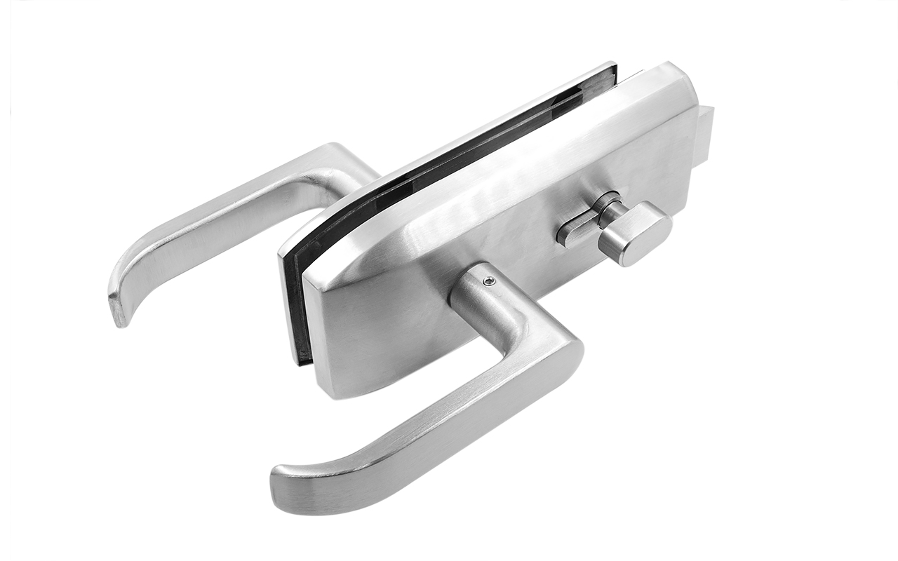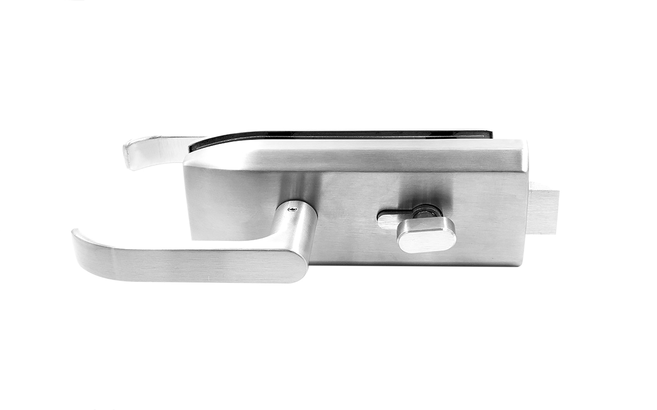 Замок с нажимной ручкой монтируется на стеклянную дверь, толщина стекла 8-12 мм.