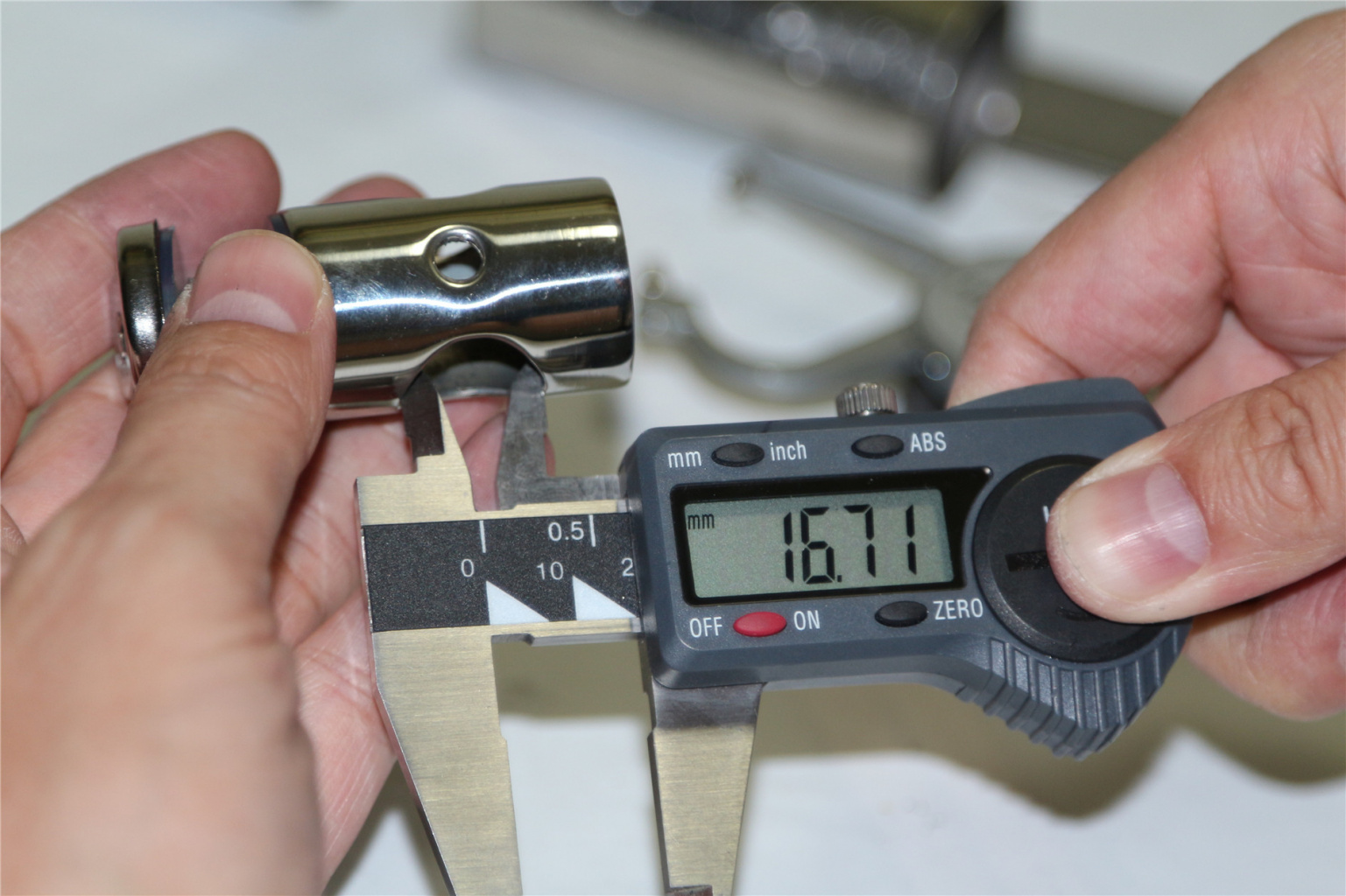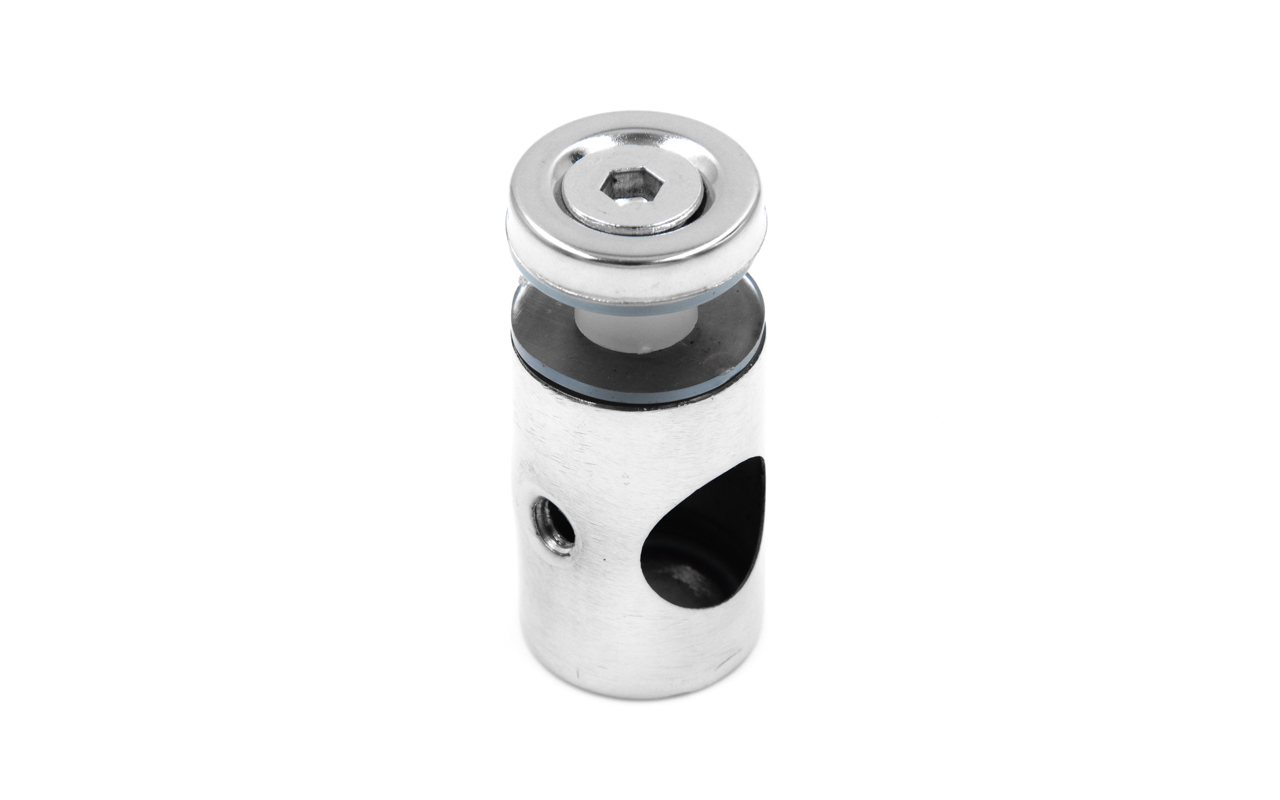 Ригеледержатель крепится насквозь к квадратной трубе стойки, входящим в комплект поставки стяжным винтом М8.Таким образом, с одонй стороны стойки видна шайба, а с другой — корпус ригеледержателя (бочонок) с зажатым внутри него ригелем.