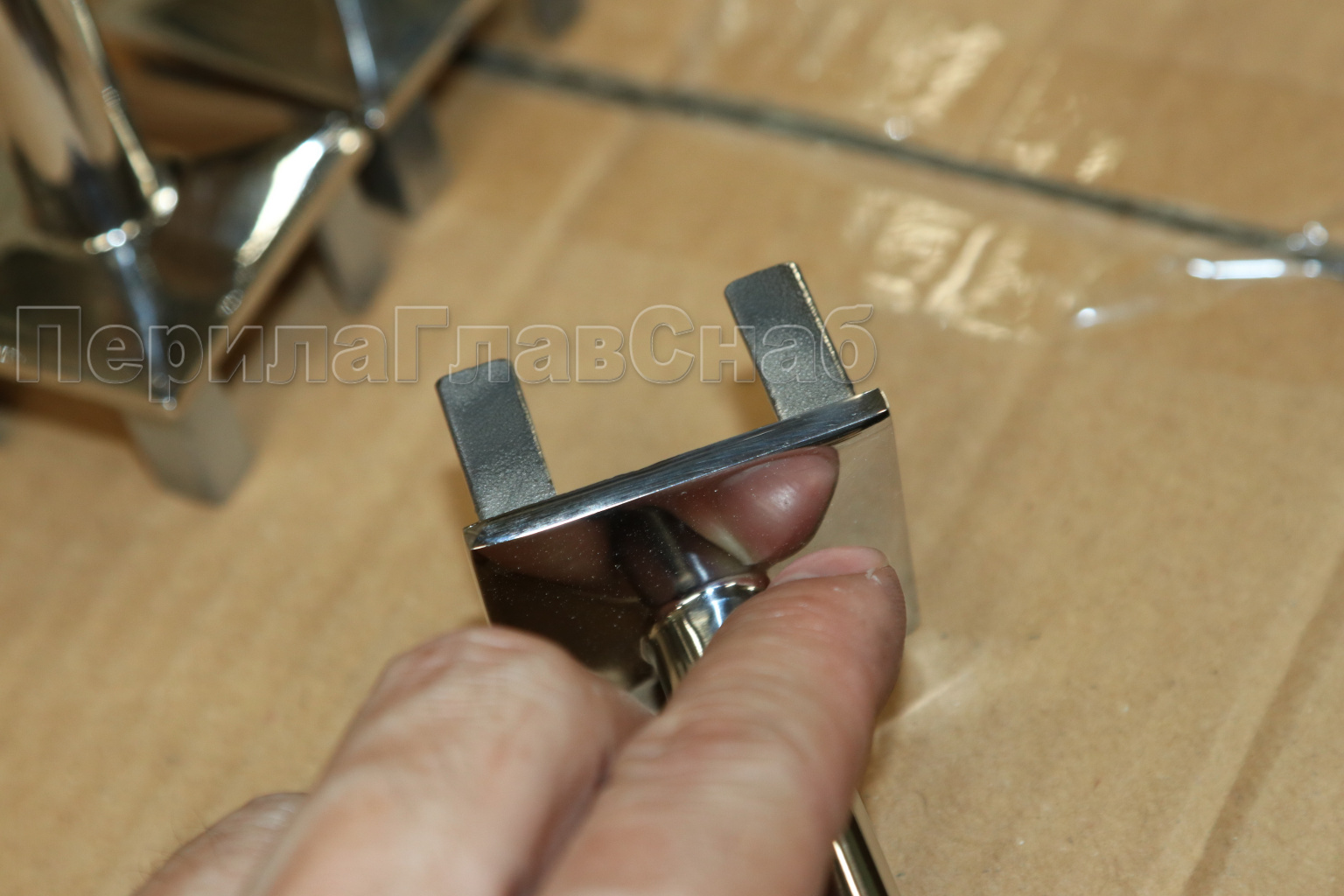 Наконечник палец на стойку из профильной трубы 40х40 мм, с регулируемым ложементом под поручень Ø50.8 мм, полированный, литой, облегченный нержавеющий AISI 304 k239-3