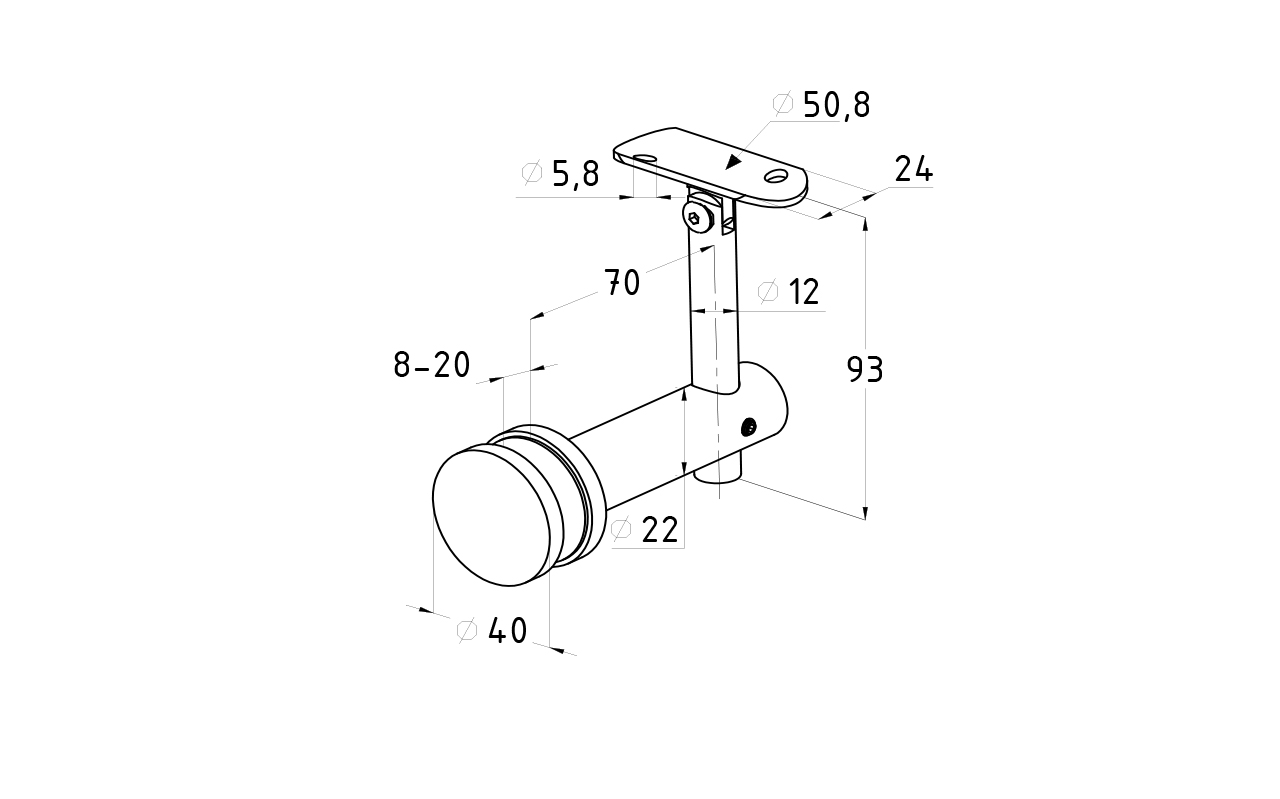Выносной держатель поручня на стекло 8-20 мм. Деталь регулируемая, шлифованная, с ложементом под трубу Ø50.8 мм. Вырез в стекле Ø17-18 мм. Марка стали - AISI 304.