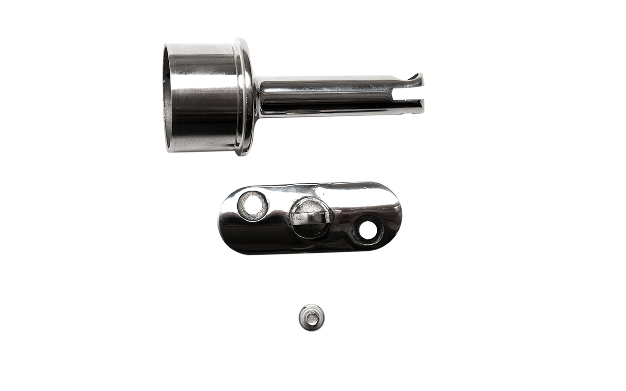 Предназначен для стойки Ø38.1 мм (k819, k849) под поручень Ø38,1-42,4 мм. Деталь с регулируемым ложементом и отверстиями под саморезы. Можно крепить как на сварку, так и на специальный клей ( , ). На сегодняшний день это наиболее распространенный тип наконечников стоек, повсеместно используемый в монтаже ограждений.