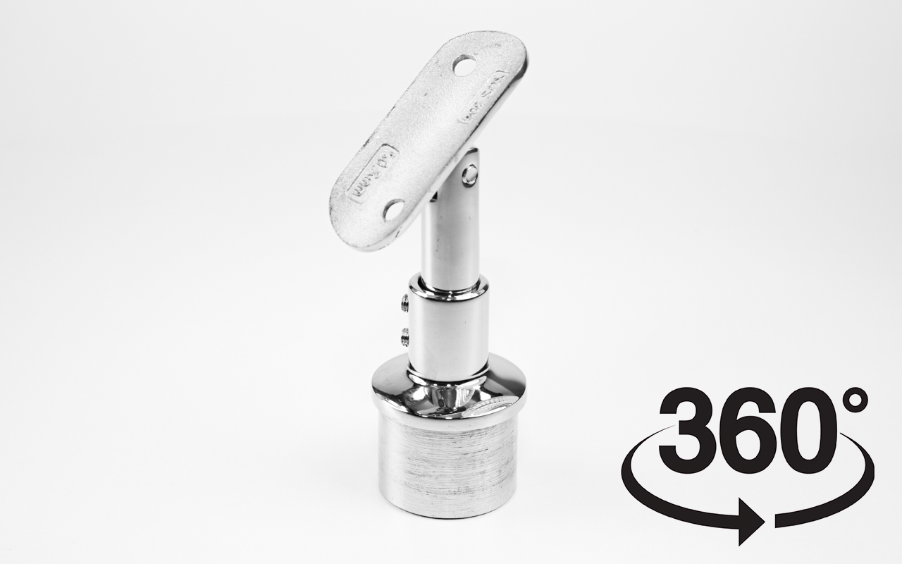 Наконечник регулируемый по высоте на стойку Ø38.1х1.5 мм, с регулируемым ложементом под поручень Ø50.8 мм. Наконечник литой, полированный, нержавеющий. Марка стали - AISI 304