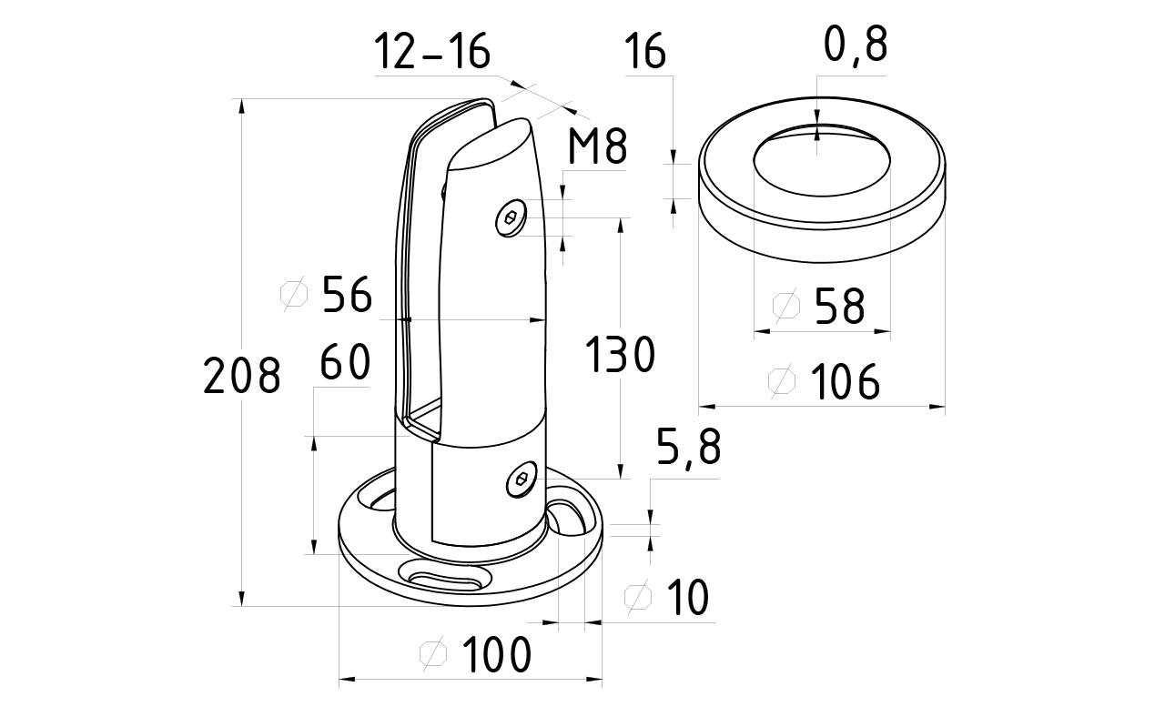Стеклодержатель литой напольный, круглый, для стекла 12-16 мм, полированный (AISI 304). Так же вам понадобиться для крепежа потайной винт под шестигранник k601-19-120.