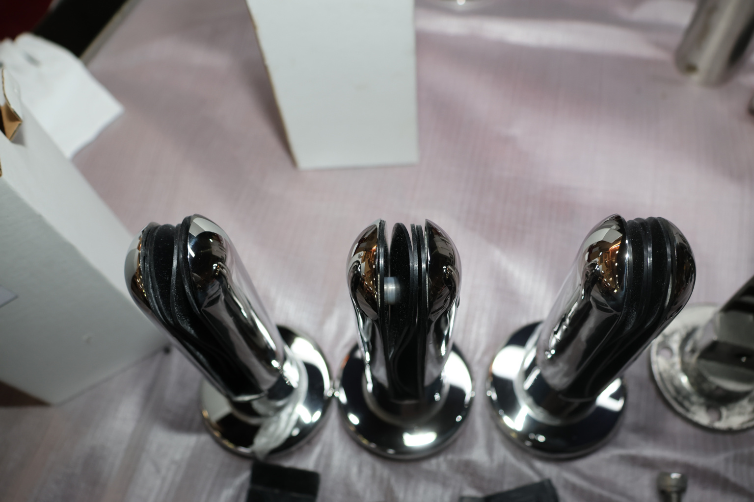 Для крепления требуется отверстие в стекле. Стойка идеально подходит для стекла 12 мм (6+6) с 2 уплотнителями. В зависимости от того, какое стекло нужно зажать, варьируется количество уплотнителей, каждый из которых имеет толщину 0.4 мм. Для стекла 10 мм (5+5) рекомендуется использовать дополнительные уплотнители из комплекта. Для закрепления стекла в стойке винт необходимо укоротить и установить вместо стандартного нижнего винта. При таких манипуляциях возможно появление щели в нижней части стеклодержателя, но на его несущую функцию это никак не повлияет.