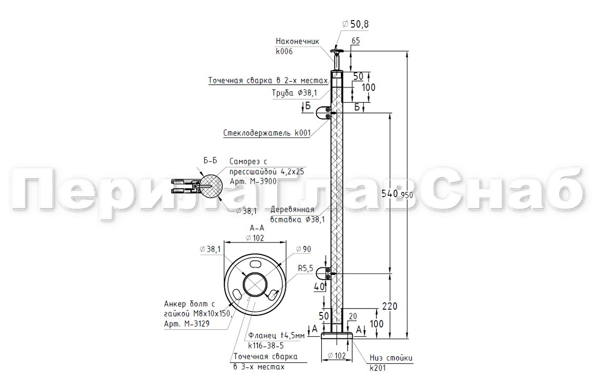 Готовая стойка Ø38,1 мм, с фланцем и наконечником, высота 950 мм, полированная (AISI 304) k702 купить в Тюмени