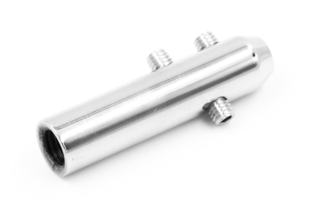 Нержавеющий держатель + натяжитель троса, литой, 50х12 мм, для троса Ø6 мм, полированный (AISI 304). Используется для крепления троса к стойкам различного диаметра, а также к плоской поверхности.