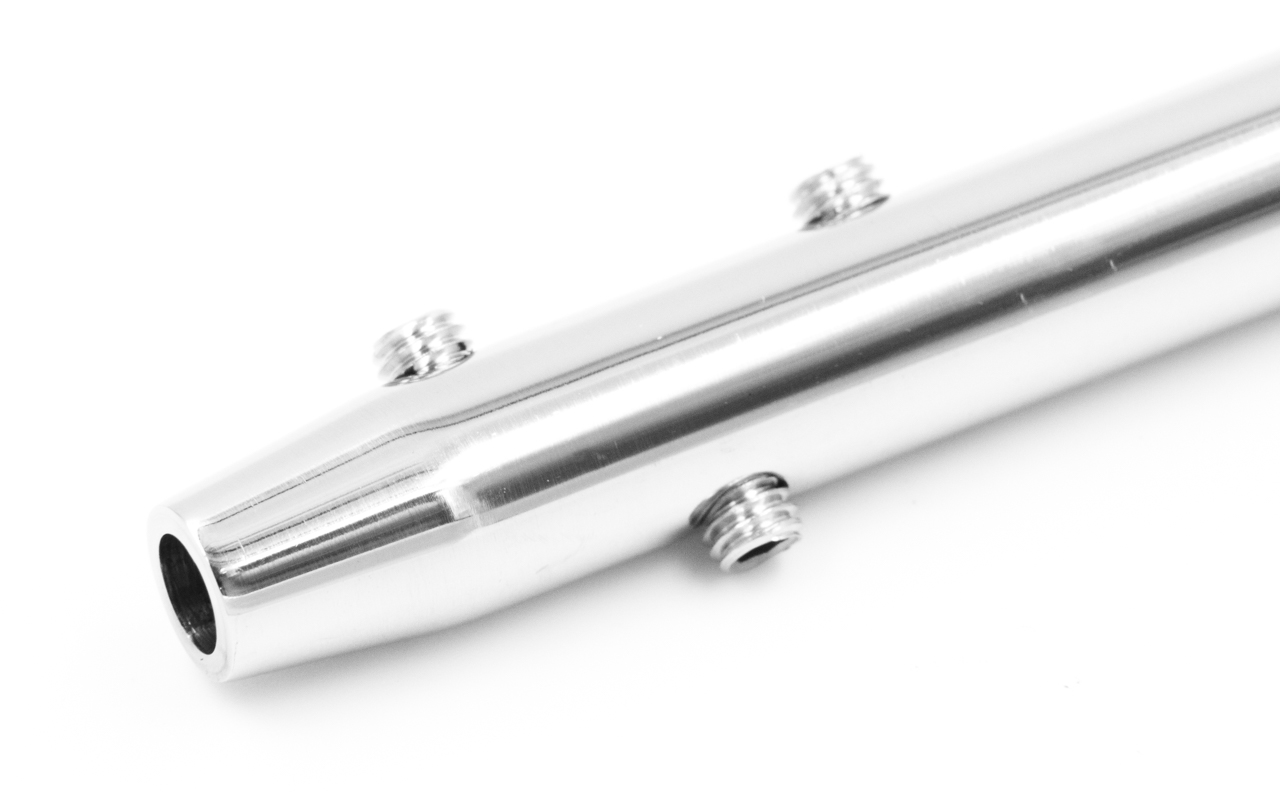 Нержавеющий держатель + натяжитель троса, литой, 80х12 мм, для троса Ø5 мм, полированный (AISI 304). Используется для крепления троса к стойкам различного диаметра, а также к плоской поверхности.