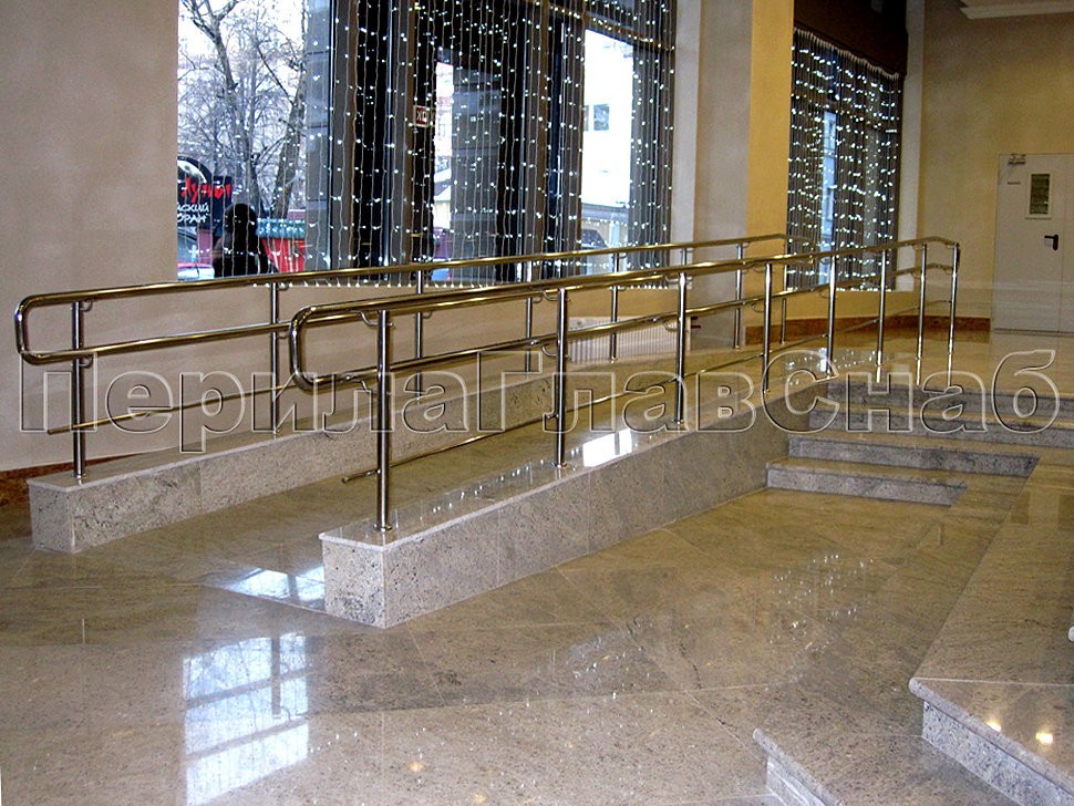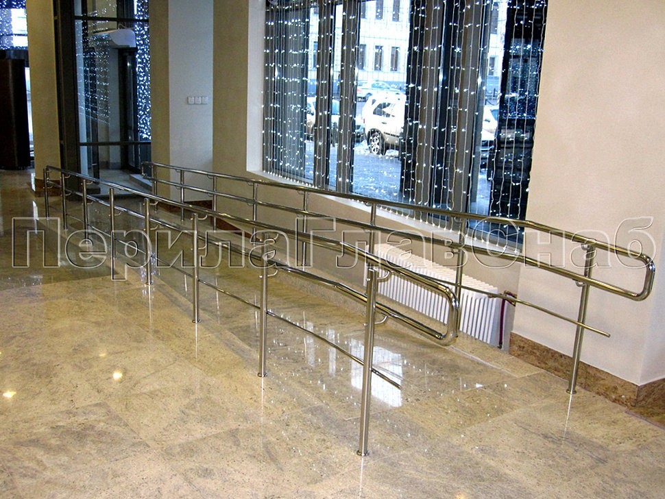 Характерной особенностью конструкций подобного рода является наличие нескольких поручней на разной высоте для облегчения хвата, как на уровне плеча человека, сидящего в инвалидной коляске, так и на уровне пояса ребенка среднего возраста и роста.