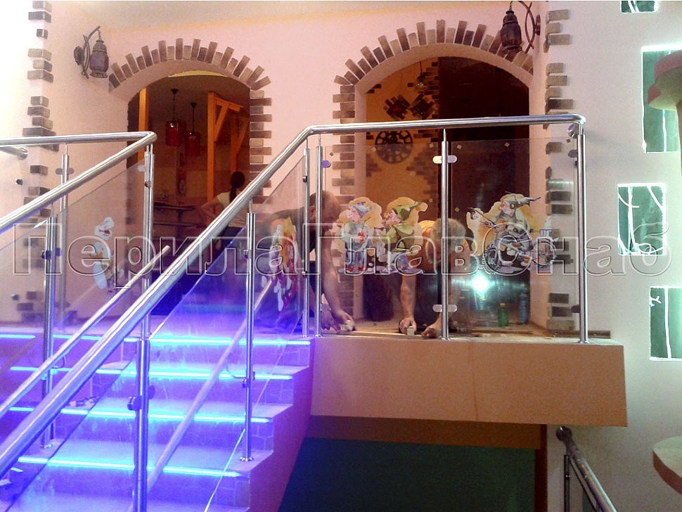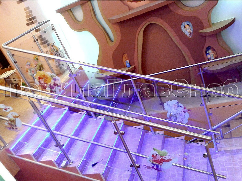 В рамках проекта были смонтированы ограждения, сочетающие в себе несущее стекло и конструкцию с ригелями. Особенностью объекта было наличие двух поручней для удобства не только взрослых, но и детей. Вся конструкция установлена с выходом в горизонт, поручень для взрослых завязан. На верхнем лестничном марше установлен детский поручень, а на нижнем - ригели с одним поворотом, прикрепленные к стойке на лестничной площадке.