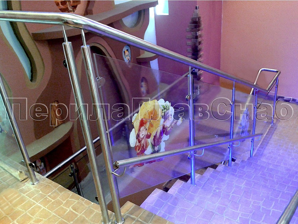 Для основных несущих стальных элементов использованы стандартные трубы с круглым сечением. С помощью наконечников "пальцев" и выносных элементов надежно закреплены поручни. На прочных держателях установлено крепкое и качественное закаленное стекло.