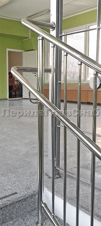 Крепление поручней к стене через фланец. Трубы поручней сделаны из нержавеющей стали. Верхний поручень крепится к стойкам через полусферические наконечники, а нижний через выносные крепления.