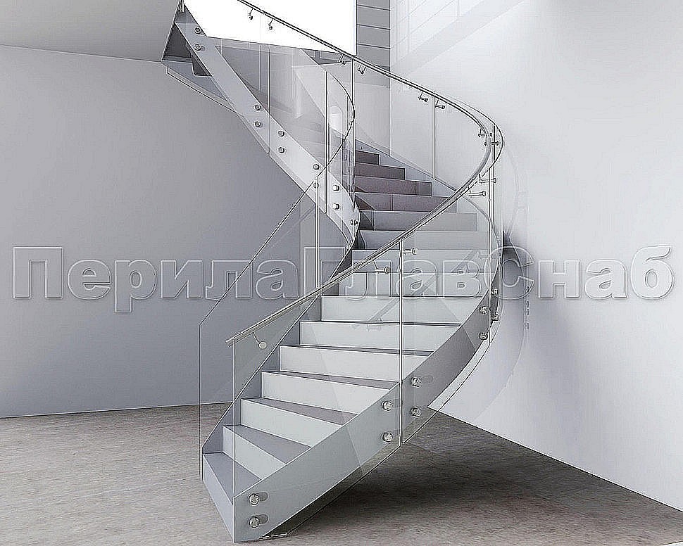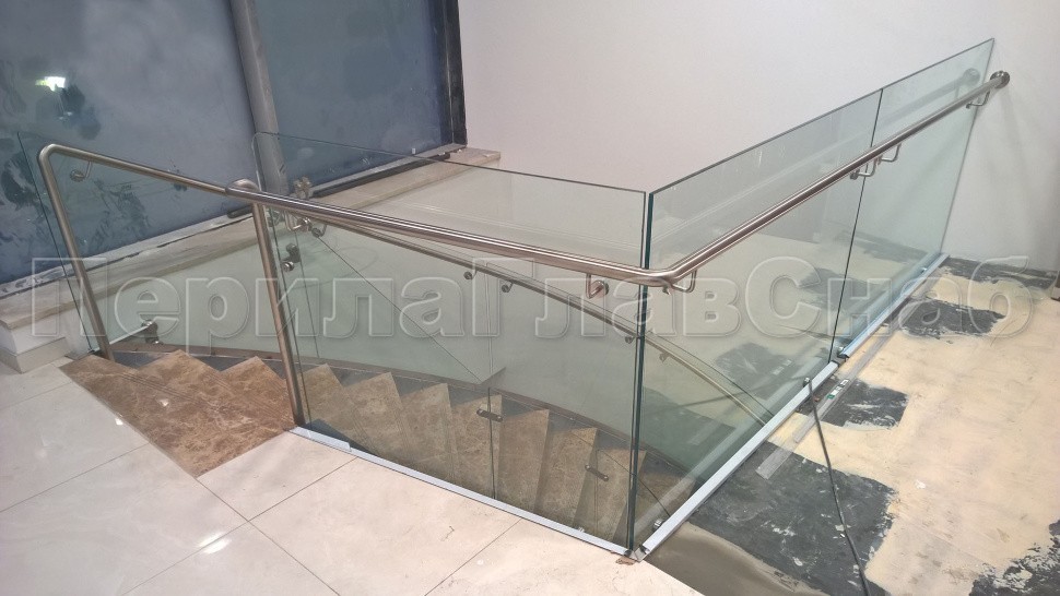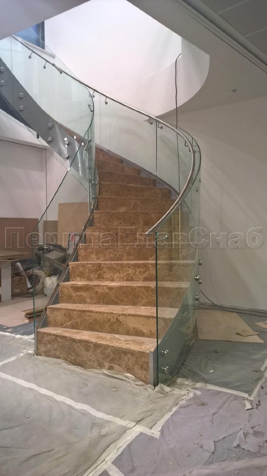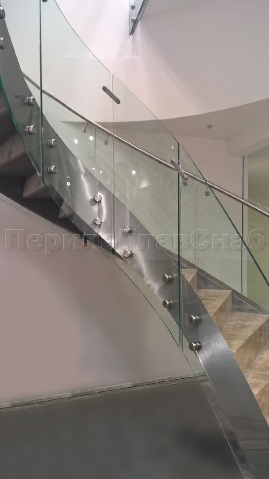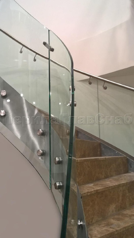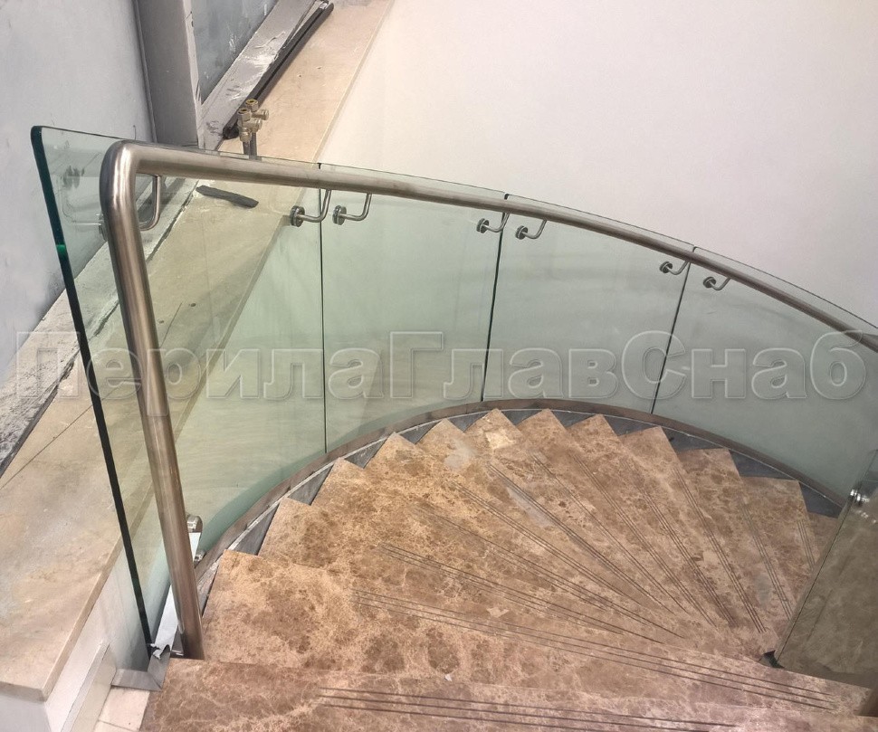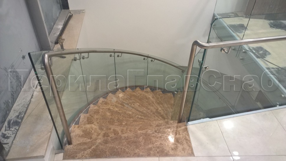 Стеклянные ограждения изготавливались из 12 мм прозрачного моллированного (гнутого) стекла. Замер и проектирования такого рода ограждений требуют высочайшей точности выполнения робот, а также высокого профессионализма сотрудником выполняющих работы.
