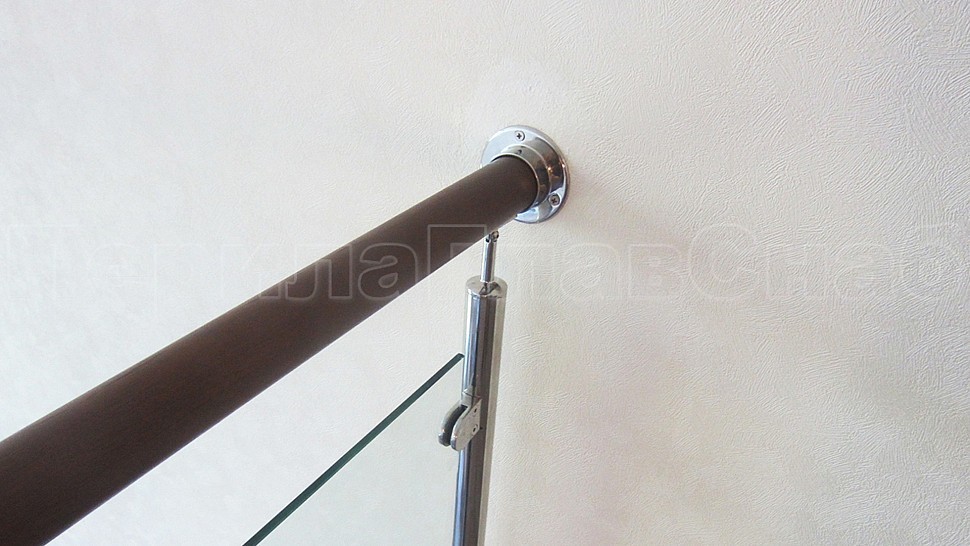 Клееный дубовый поручень крепится над стойками. Окончание поручня заглушка из полированной нержавеющей стали. Поручень крепится к держателю поручня на саморезах с полукруглой головкой. Поручень завязан между маршами дубовыми отводами через нержавеющие кольца с круглыми проставками из дуба.