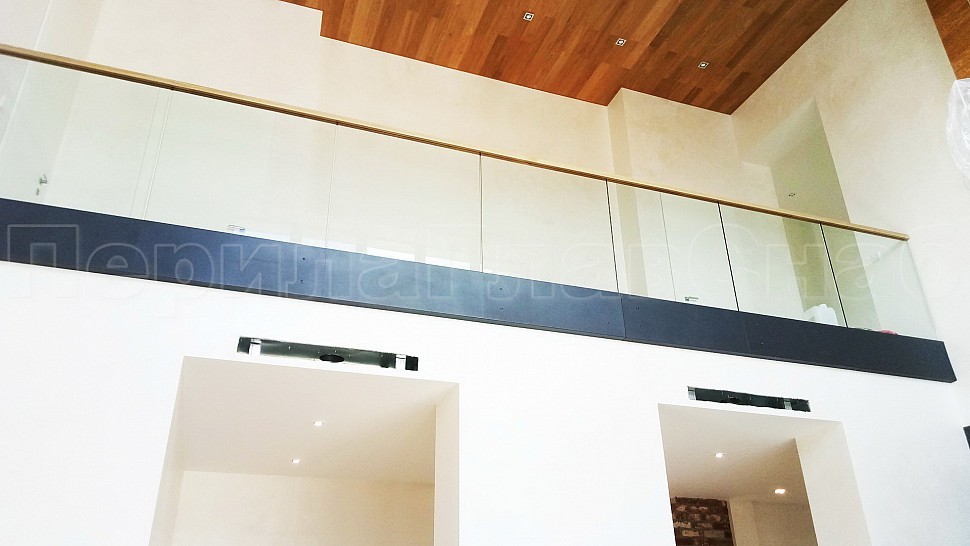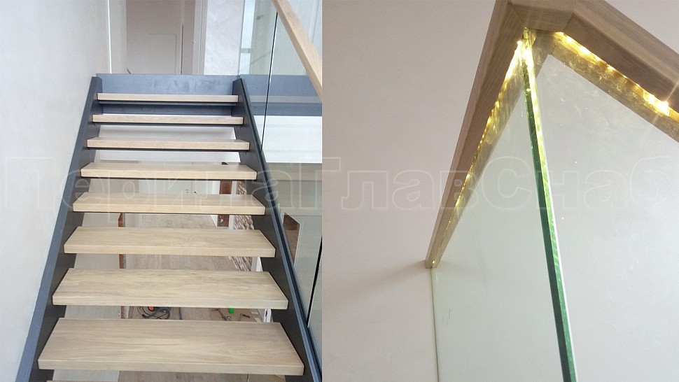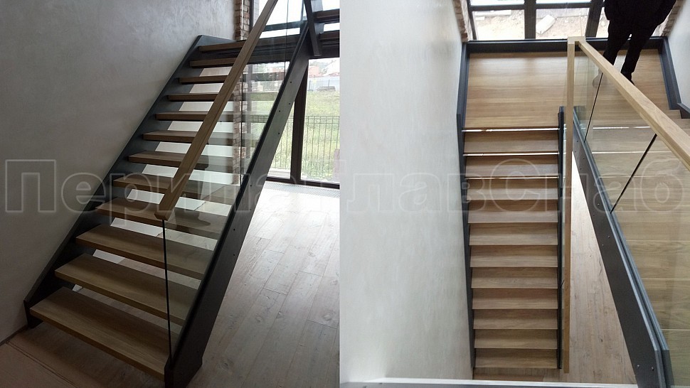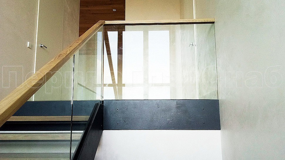 Нашей бригадой была установлена лестница на двух тетивах, выполненных из листа толщиной 10 мм из черного металла с покраской по , с деревянными ступенями толщиной 50 мм из дуба- окрашены согласно каталогу . Ограждения лестницы внутренние и второго света выполнены из закалённого прозрачного стекла толщиной 12мм, на стекла через паз крепится деревянный поручень габаритами 50x40мм- так же как ступени, окрашен согласно каталогу морилок. Само стекло крепится с торца при помощи точечного держателя из нержавеющей стали. Также были установлены подобные ограждения с поручнем на атриум в доме.