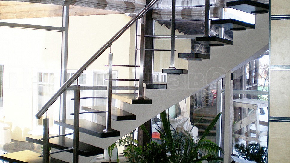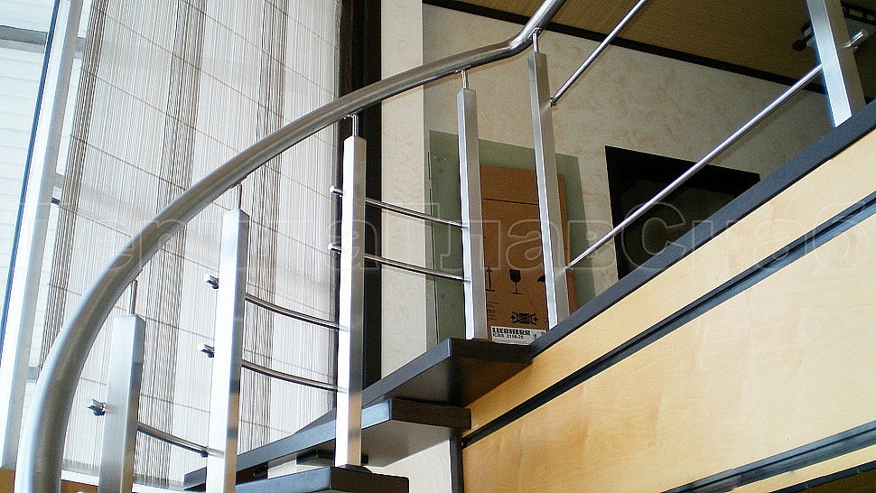 В загородный дом было установлено стильное ограждение из шлифованной нержавеющей стали высотой 950 мм с двумя ригелями диаметром 16 мм и поручнем 50 мм, стойками 40Х40 мм, которые устанавливаются через ступень на вторую.