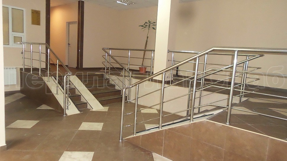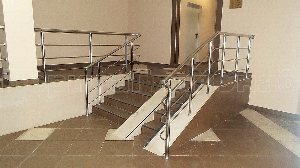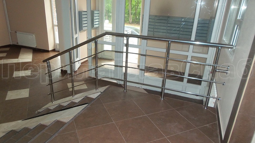 Каждый жилец в многоквартирном доме хочет, чтобы его подъезд был самым красивым, удобным и безопасным. Такой заказ поступил к нам в компанию. Внутри подъезда были установлены ограждения из полированной нержавеющей стали AISI 201. Ригели высотой 900 мм, стойками диаметром 38 мм, креплением сверху с методом алмазного бурения диаметром 42 мм на глубину 70 мм, устанавливаются через две ступени в третью, наконечник стойки сфера и ригель диаметром 16 мм, ригель крепится к стойке сваркой снизу; низ стойки декоративная крышка диаметром 56 мм, поручень диаметром 50,8 мм. Крепление нержавеющих элементов ограждения между собой точечная аргонно-дуговая сварка с последующей зачисткой и полировкой. Облицовка лифтовых порталов шлифованной нержавеющей сталью AISI430 толщина 1 мм.