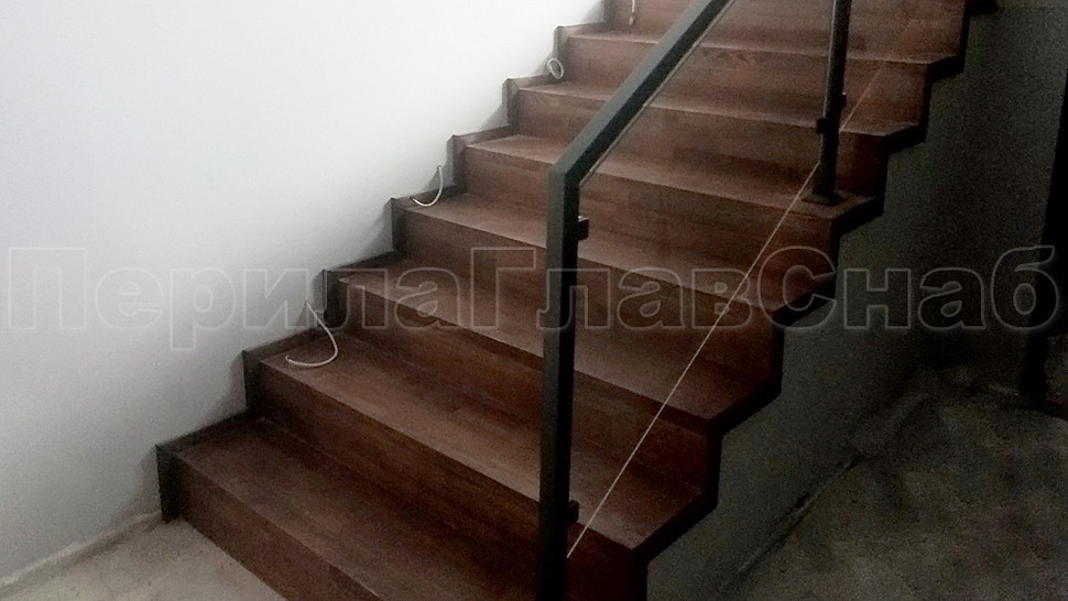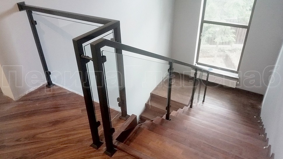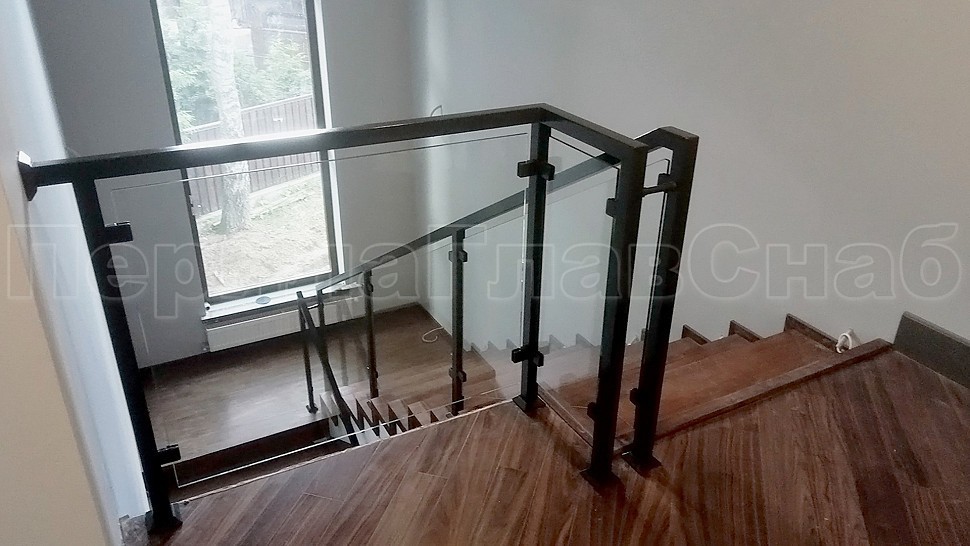 В компанию поступил заказ на ограждение лестницы из черного металла со стеклом. Высотой 950 мм и стойками 40х40 мм из черного металла, крепление стоек сверху методом бурения, стекло каленое прозрачное 8 мм, крепятся на штампованные зажимные стеклодержатели покраска по RAL (серый антрацит), поручень профильная труба 40х40 мм из черного металла, поручень завязан, окончание поручня заглушка.