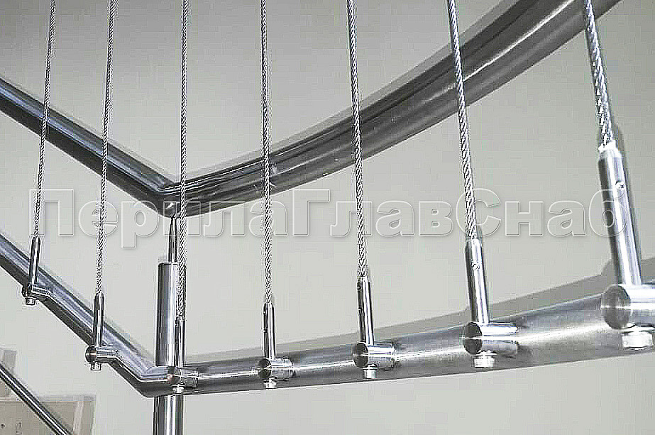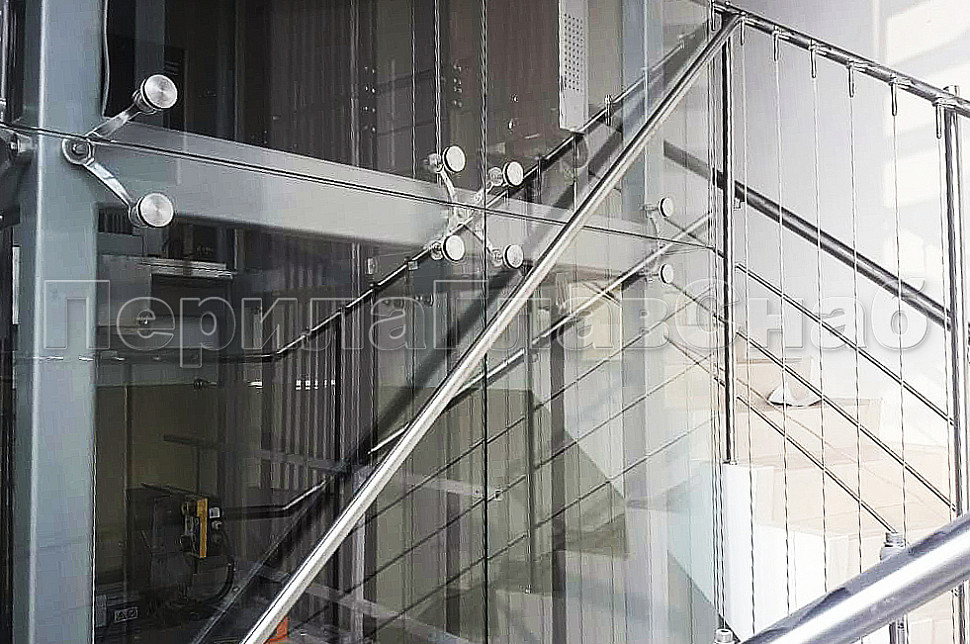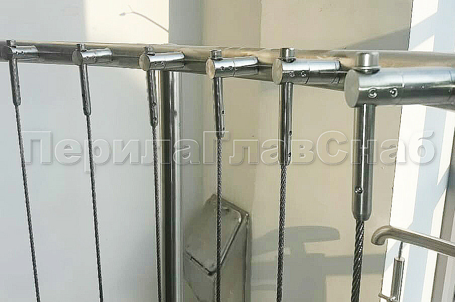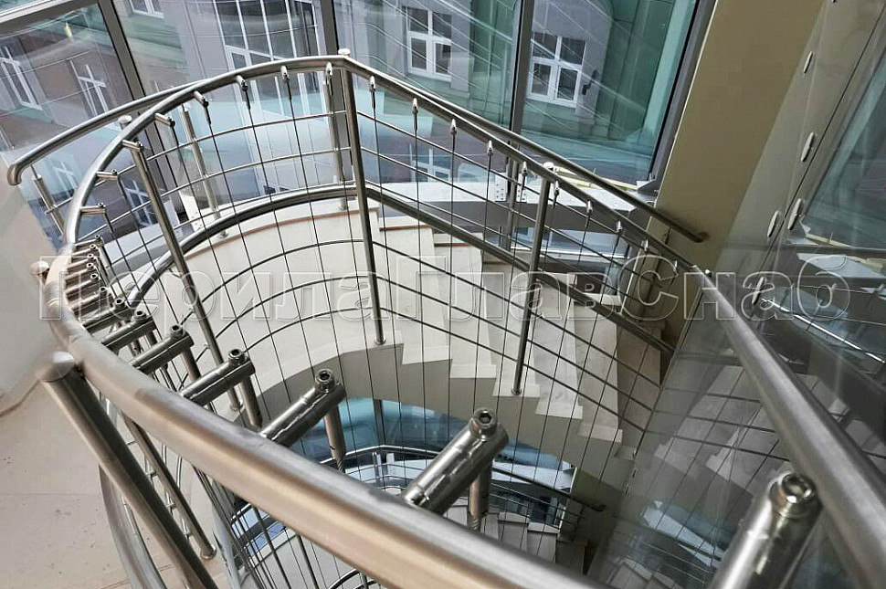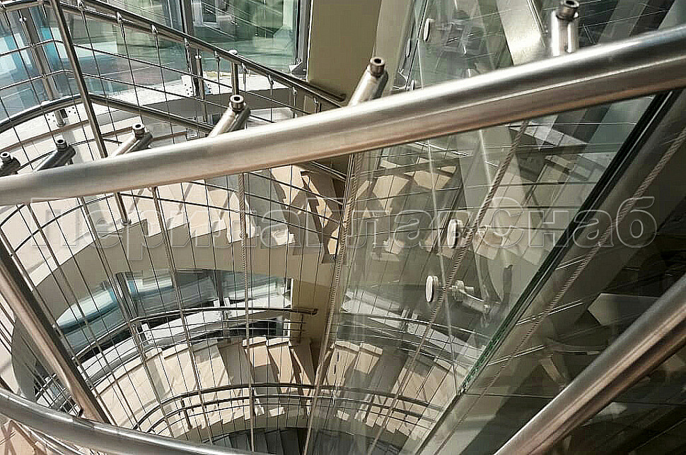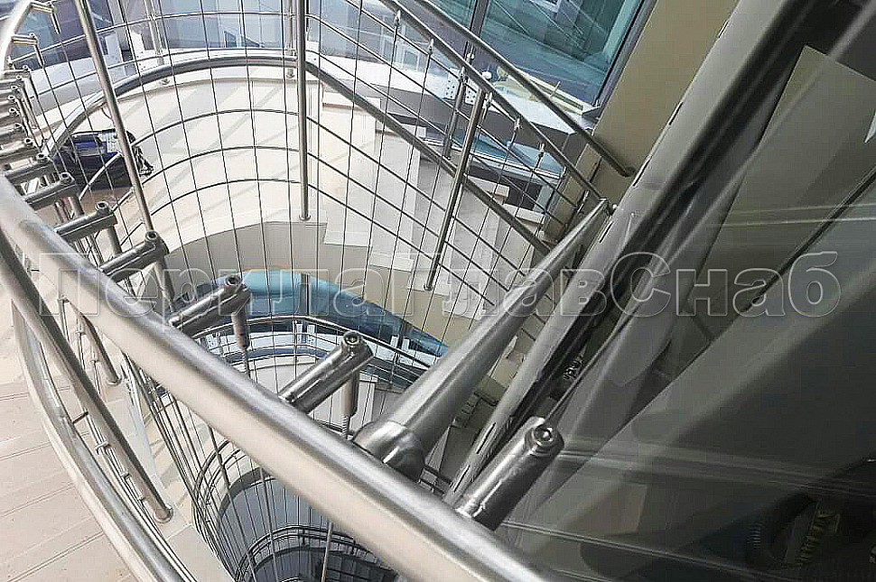Тросовые ограждения на лестницу и площадки в жилой дом со 2 по 7 этаж из шлифованной нержавеющей стали с 2 - мя ригелями. Хочется отметить вертикальное тросовое заполнение, которое делает ограждения более безопасными в эксплуатации.