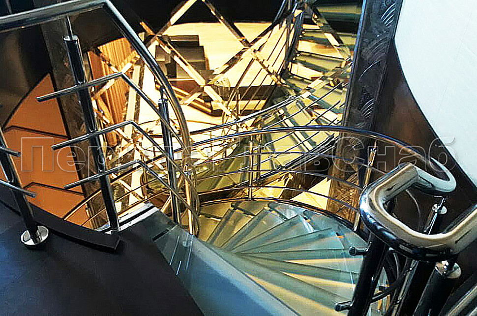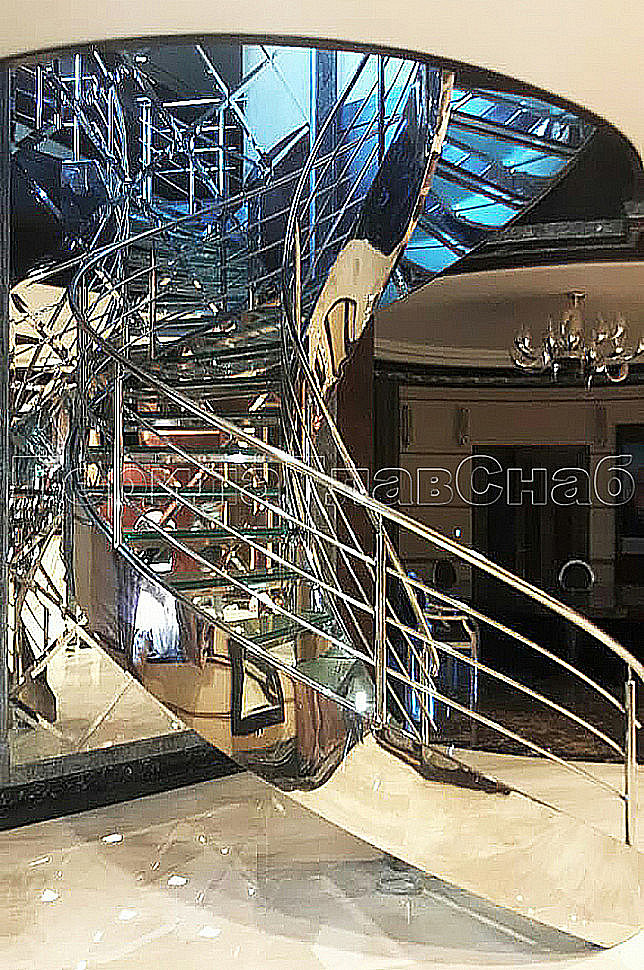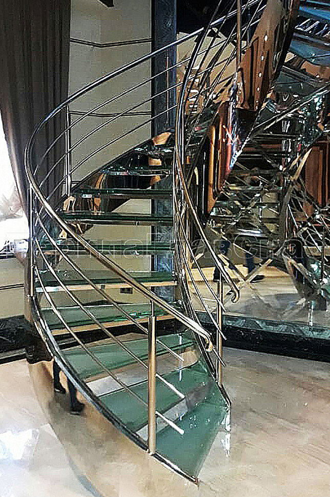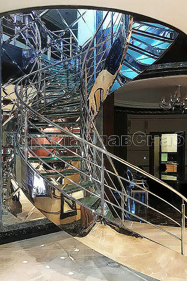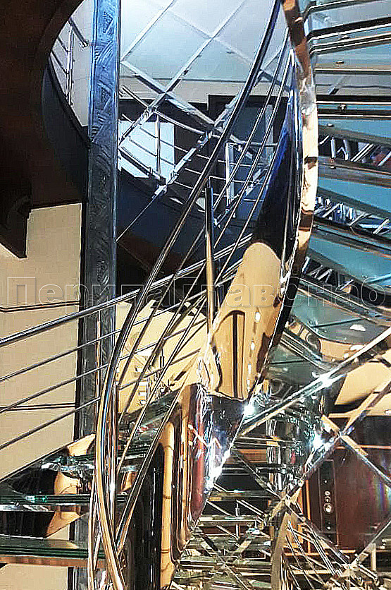 Винтовая лестница позволяет компактно расположить переход с этажа на этаж и сделать помещение более просторным. Закрученная конструкция из труб, выполненных из нержавеющей стали, дополнена стеклянными ступеньками, которые предоставляют простор для подсветки и общего оживления интерьера.Жесткость конструкции получена благодаря применения тетив из толстого металла, который прокатан по винту и обшит декоративным листом из полированной нержавеющей стали. Тетива — основной несущий элемент, к которому крепятся ступени.