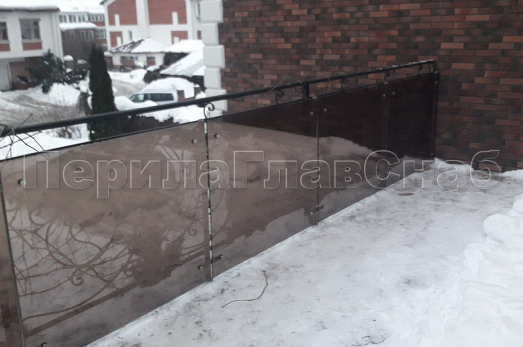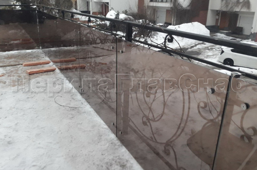 В ПерилаГлавСнаб поступил интересный запрос в зимний период времени. Необходимо было оградить от ветра и от лишних глаз летнюю террасу в Митинском районе города Москвы. Правильный подход «готовь сани с лета» позволит уже весной насладиться чаепитием и прочтением книги на открытом воздухе. У клиента уже стояло ограждение предусмотренное застройщиком, которое по нормам демонтировать строго запрещено. Нашими инженерами было предложено конструктивное решение в виде ограждения из закаленного стекла на стойках из нержавеющей стали AISI 304. Стекло держится на пластинчатых стекло держателях, технология которых позволяет намертво закрепить его. А это значит, что данный вид ограждения выдержит любую ветровую нагрузку. Стойки монтировали прямо в бетонное основание террасы на специальную зимнюю химию, что обеспечивало скорейшее застывание клеевого состава. Точная и выверенная работа инженера-конструктора позволила произвести безошибочный замер стекол на шестнадцати погонных метрах. Еще одной задачей проекта являлась непросматриваемость балкона. Была подобрана специальная двусторонняя защитная пленка, которую наносили на стекло в заводских условиях с гарантией. Со стороны улицы пленка дает эффект зеркала стеклу. Т.е. абсолютно не видно что происходит за ограждением. А со стороны террасы пленка имеет бронзовый оттенок, который перекликается с отделочными материалами стен и просматривается все, что происходит во дворе дома. Очень лаконичное и продуманное решение стоимостью всего 13 800 рублей за погонный метр.
