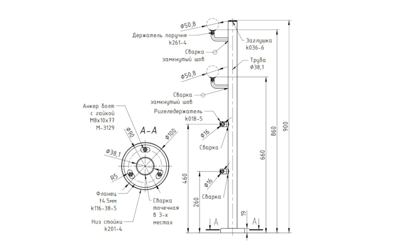 Стойка для пандуса: под 2 поручня Ø38,1-50,8мм мм для инвалидов, одноанкерный крепеж, полированная, высота 900 мм (AISI 304) k750-5 купить в Тюмени