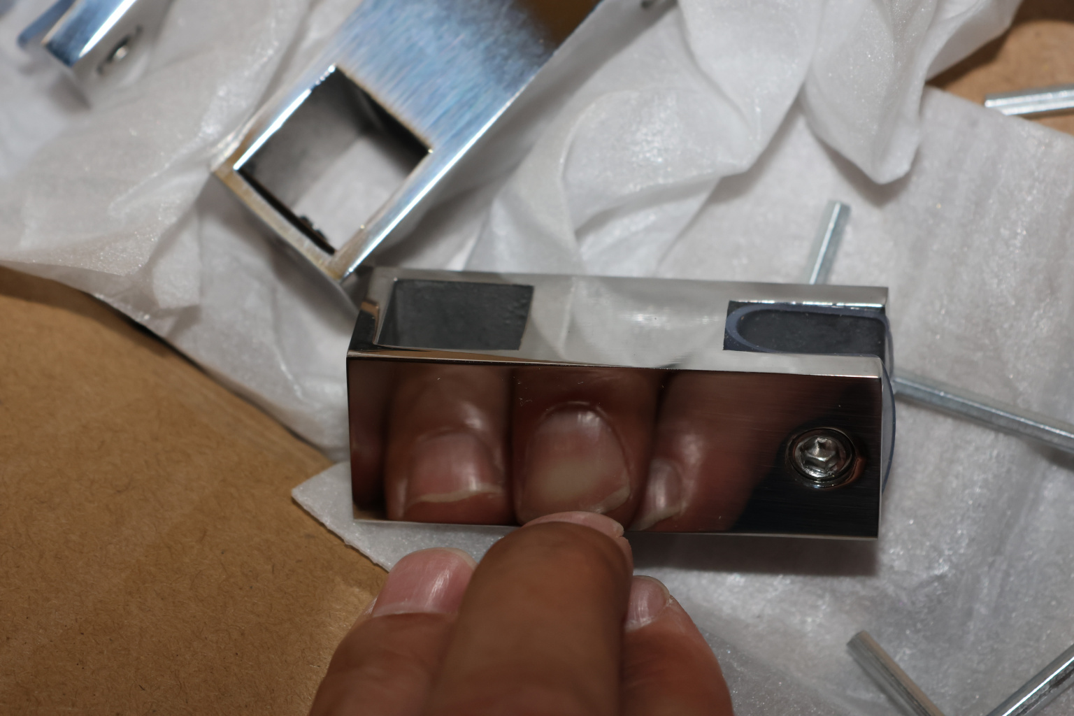 Крепежный элемент сквозной для трубы 15х15мм. Деталь полированная, марка стали - AISI 304.