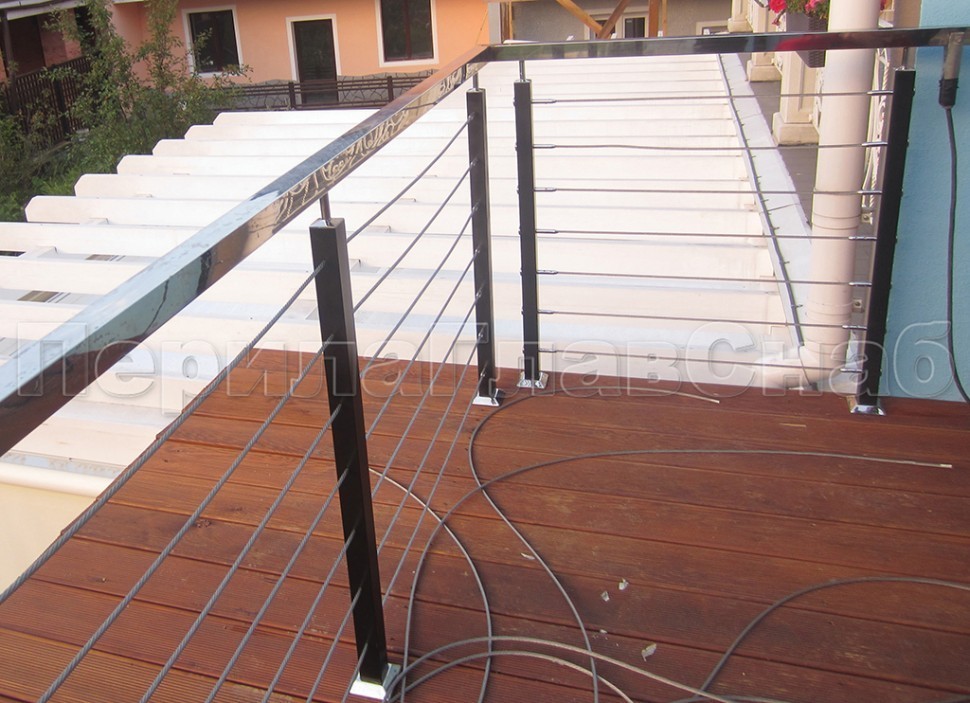 Ограждения из нержавейки. Заполнение из 2х тросиков. Квадратные стойки