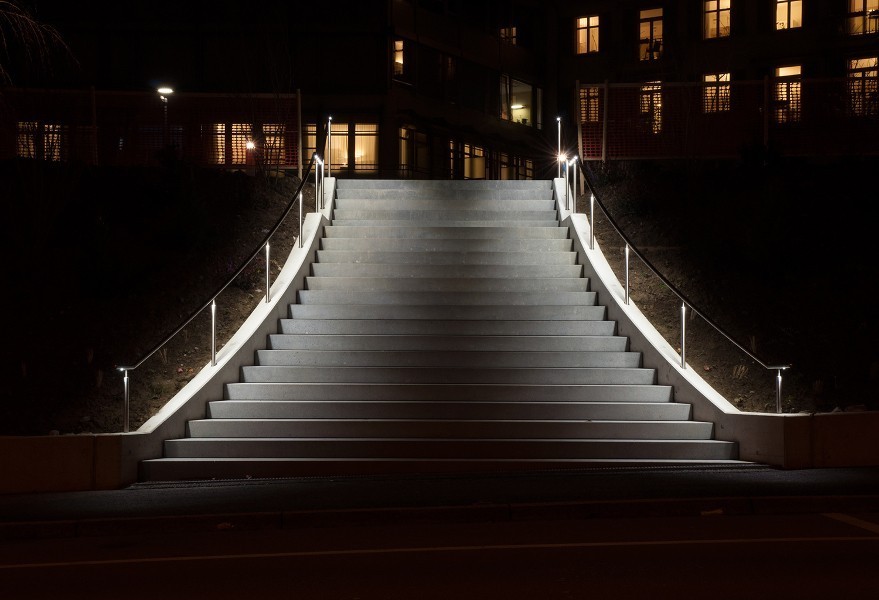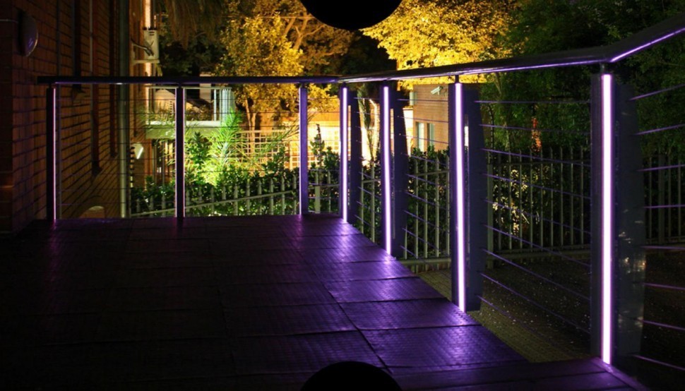 Часто используют подсветку поручня на ограждениях на улице, для эффектной подсветки проходных участков, а также для визуального отделения пешеходной и проезжей части