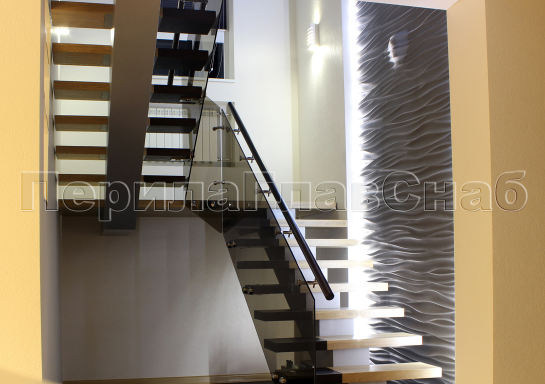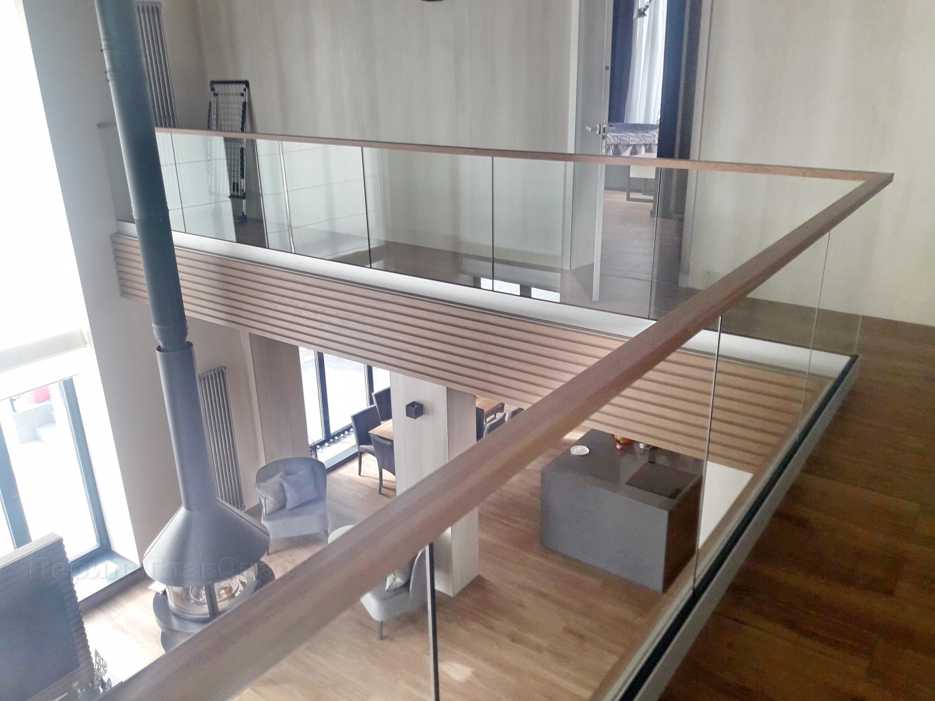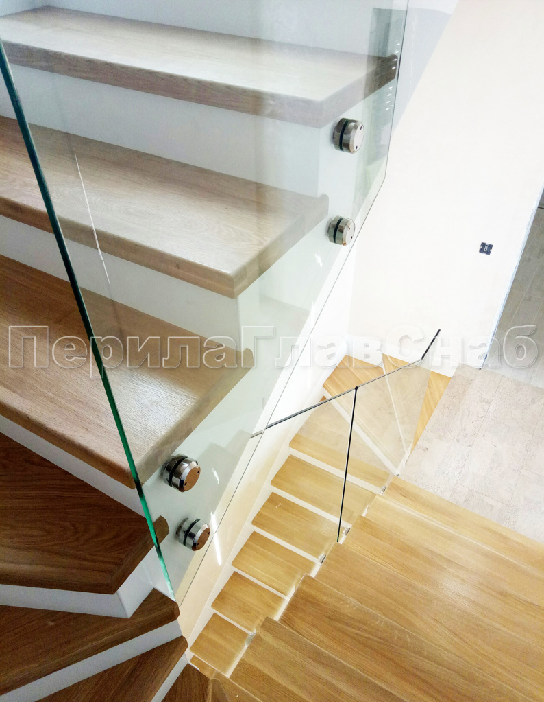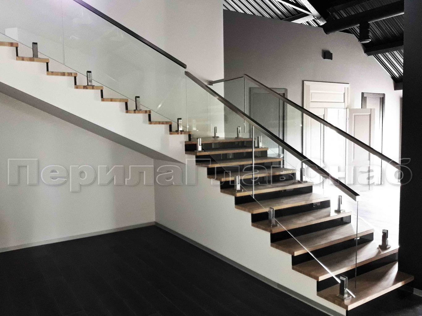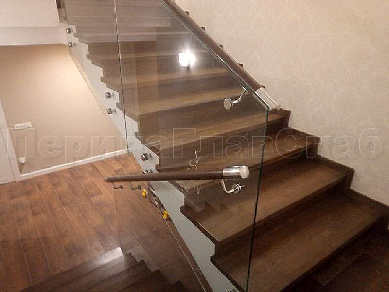 Ограждение с деревянным поручнем на выносе на точечном креплении на лестнице