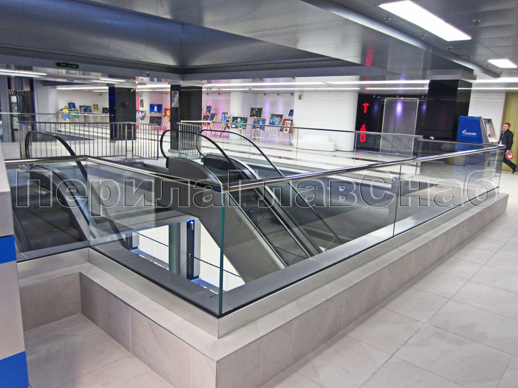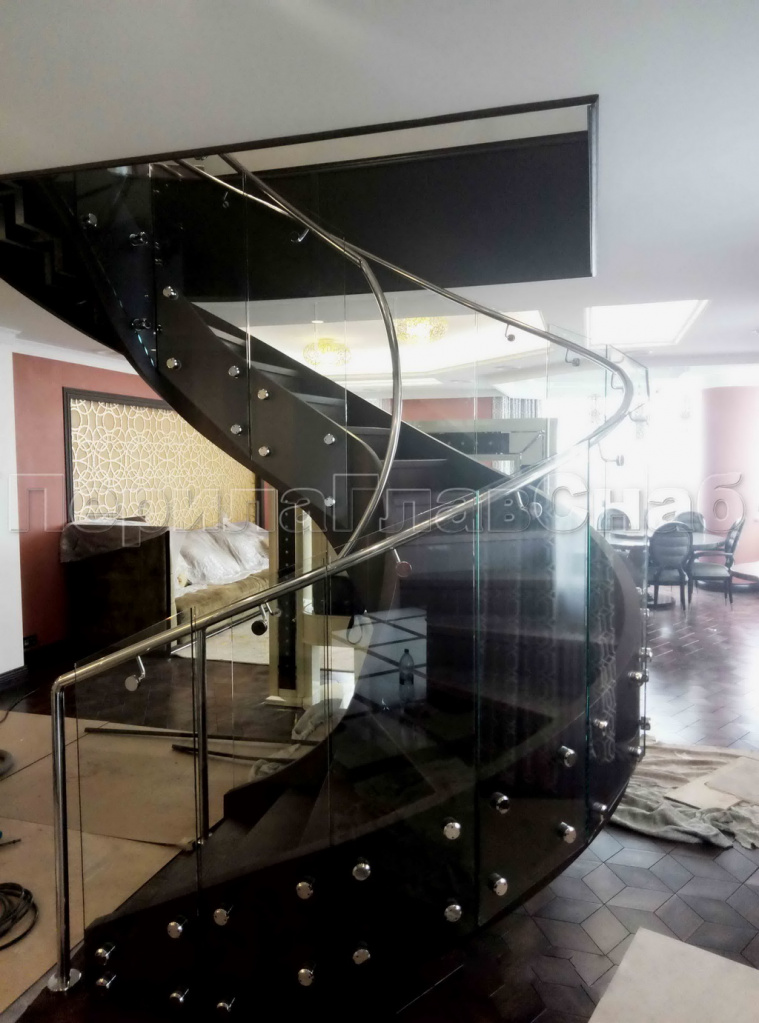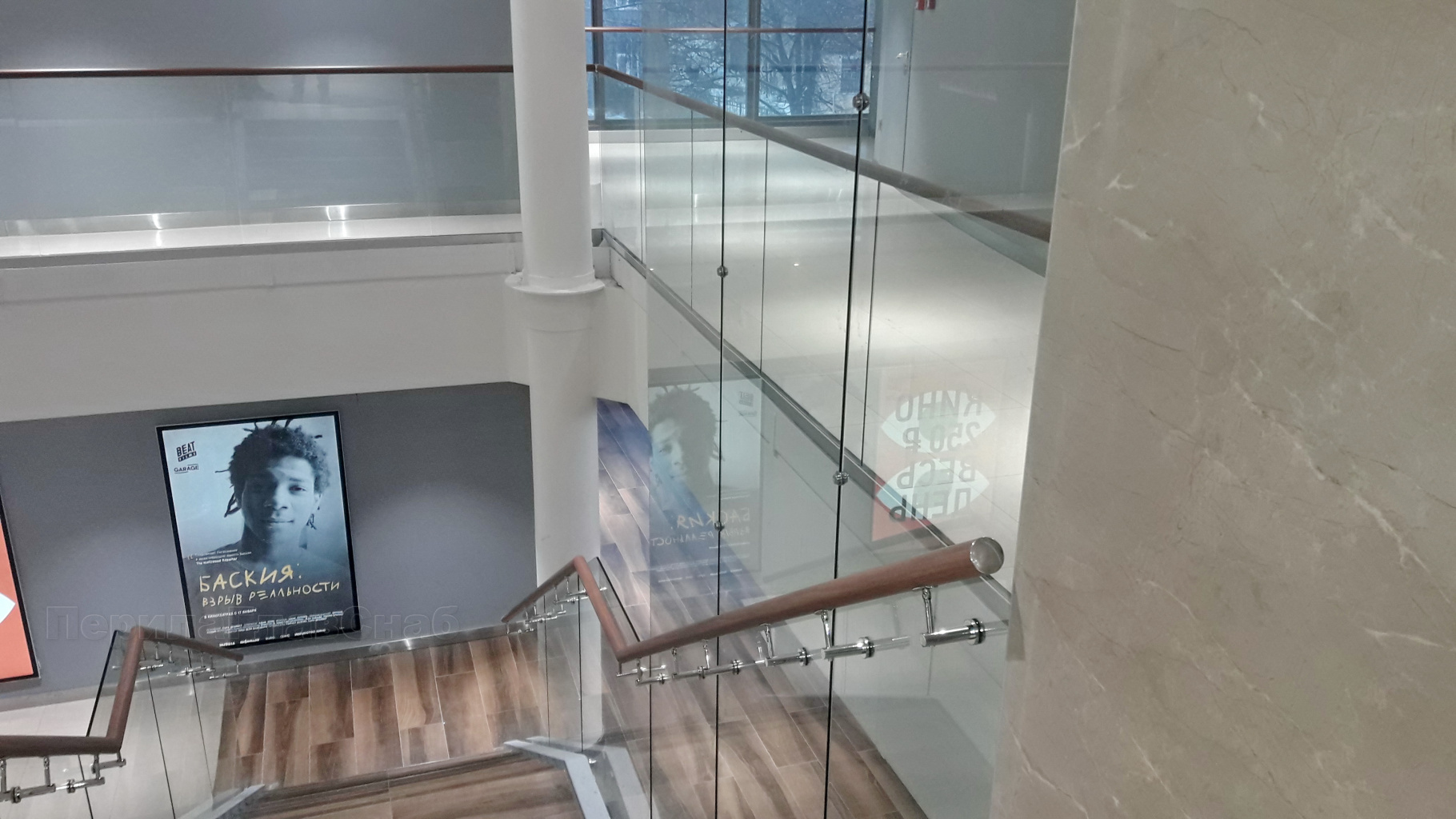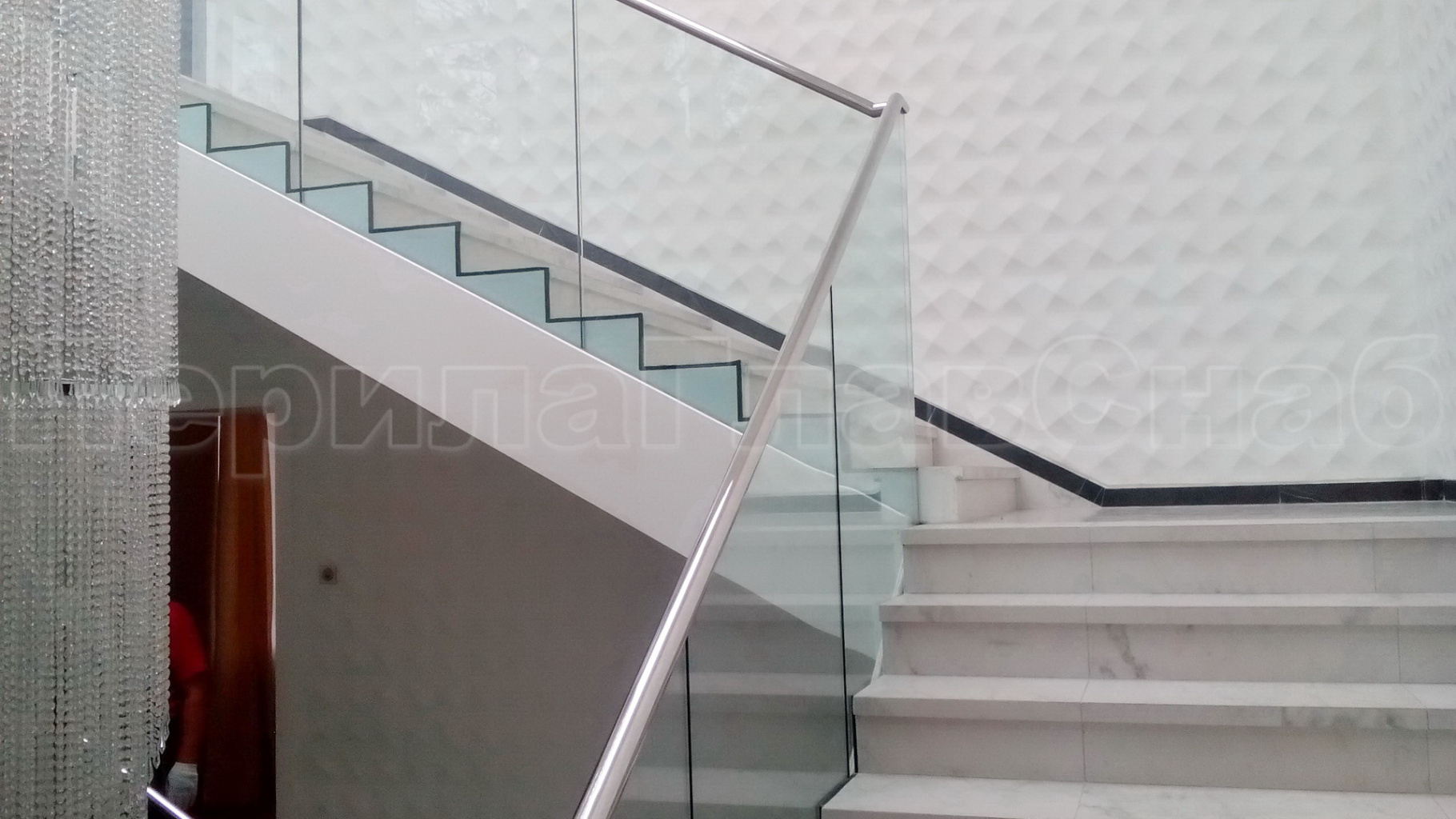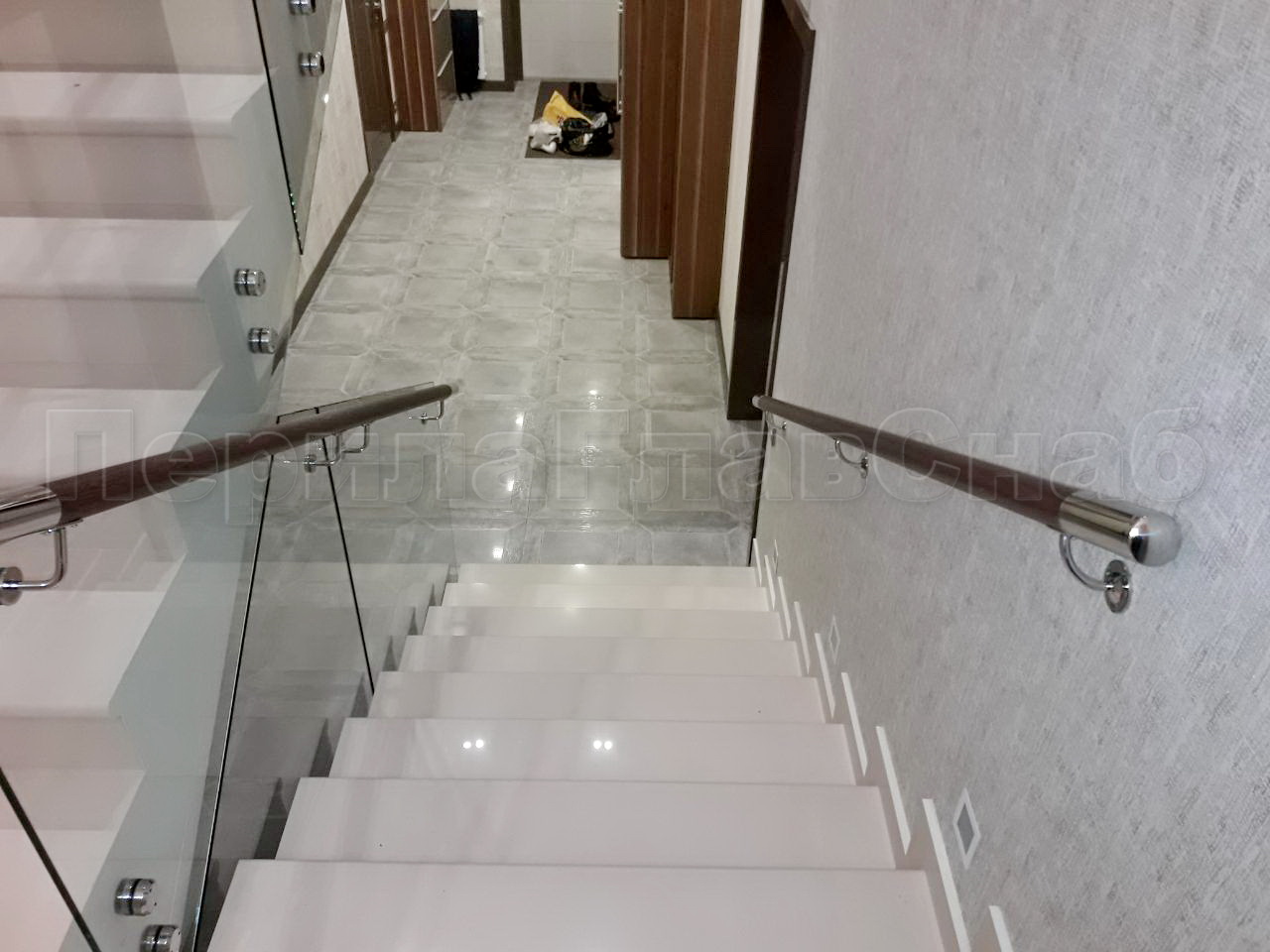 Ограждение с профильным поручнем с пазом на точечном креплении на лестнице