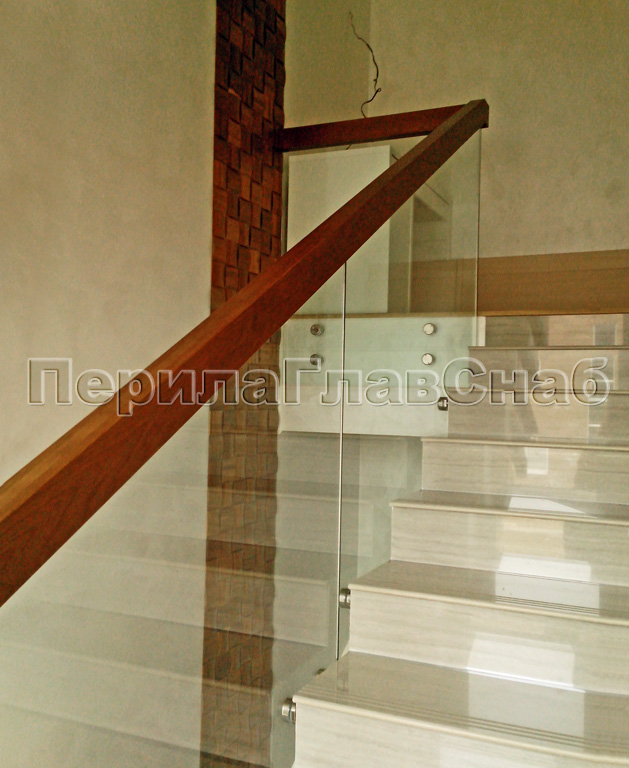 Ограждение с квадратным деревянным поручнем на точечном креплении на лестнице