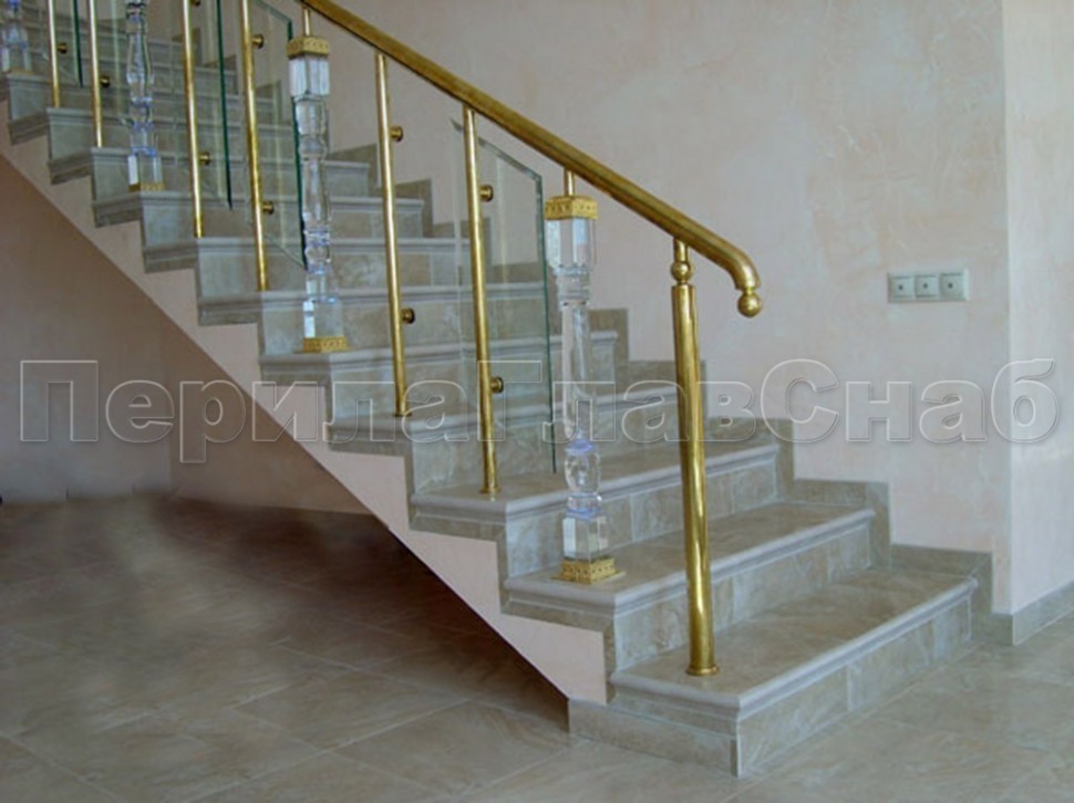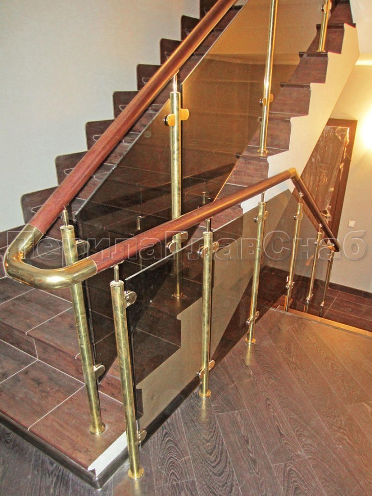 Записаться на встречу Ограждение лестницы со стеклом, тонированным в массе, стойки и завязки поручня из латуни