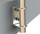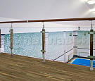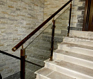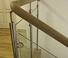 Записаться на встречу Ограждение с круглым деревянным поручнем с зажимными стеклодержателями и стойками с деревянными вставками