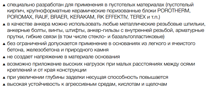 Благодаря уникальной разработке такого химического анкера, можно с легкостью выполнять соединения близко другу от друга, а также от края конструкции, при этом абсолютно исключается напряжение внутри материала, что не нарушает целостность основания.