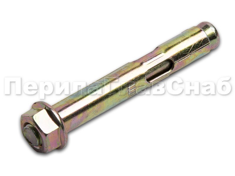 Анкер болт с гайкой представляет собой сложное крепежное изделие, которое состоит из втулки(внешней оболочки), шпильки с распором с конусом на конце и гайки-прокладки с запрессованной шайбой. При монтаже анкерного болта с гайкой, шпилька выступает за края анкера, и увеличивает его общую длину, а при закручивании гайки, шпилька с распором перемещается в сторону гайки, расклинивая втулку (внешнюю оболочку), которая и упирается в стенки отверстия, обеспечивая надежность крепления.