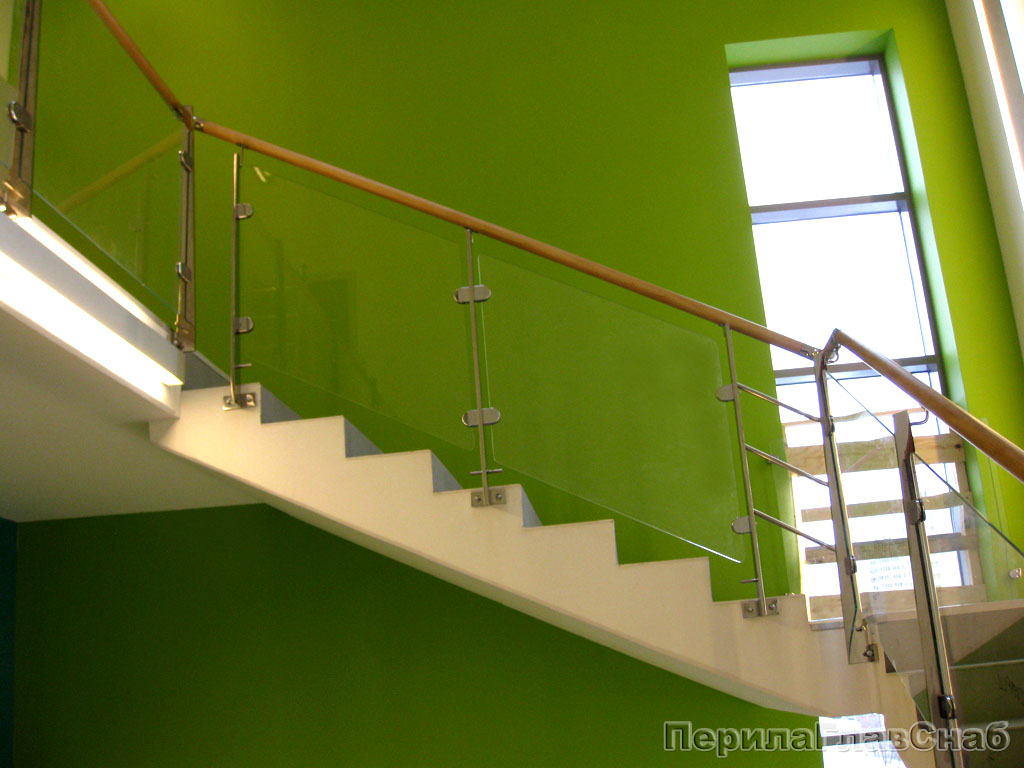 - Поручень - деревянная труба с пазом. Как дополнительная опция - можно включить подсветку стекла.