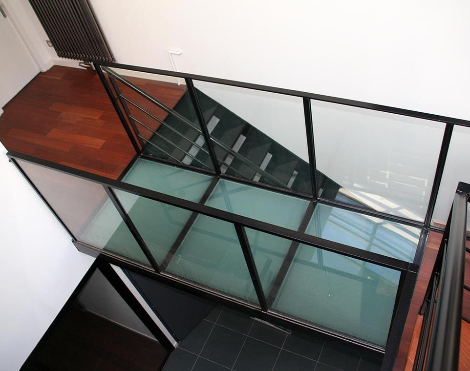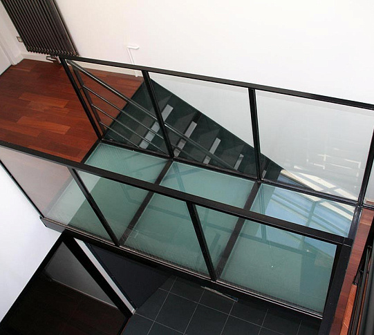 Стеклянное перекрытие из матового стекла на внутреннем балконе